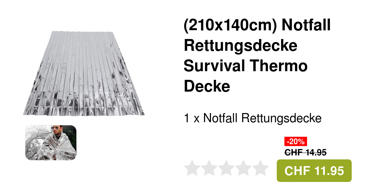 Immer vorbereitet sein! Diese robuste Rettungsdecke ist ein Muss für jede Notfallausrüstung. Mit 210x160cm groß genug, um eine Person komplett einzuhüllen. Erhältlich in Silber (reflektiert Körperwärme) und Gold (absorbiert Wärme) - je nach Einsatzgebiet die richtige Wahl. Aus strapazierfähigem PET-Material, das wasserdicht, winddicht und reißfest ist. Wiegt nur 100 Gramm - passt in jeden Rucksack! Perfekt für Outdoor-Aktivitäten: Camping, Wandern, Trekking, Bootfahren oder Jagd. Kann auch als Sonnenschutz, Bodendecker oder Trage verwendet werden. Im Auto praktisch als Windschutzscheiben-Abdeckung an heißen Tagen. In Notsituationen lebenswichtig zur Vorbeugung von Unterkühlung. Kompakt zusammengefaltet, nimmt kaum Platz weg. Ein unverzichtbares Teil für jeden Erste-Hilfe-Kasten, Auto-Notfallset oder Outdoor-Ausrüstung. Besser haben und nicht brauchen, als brauchen und nicht haben!