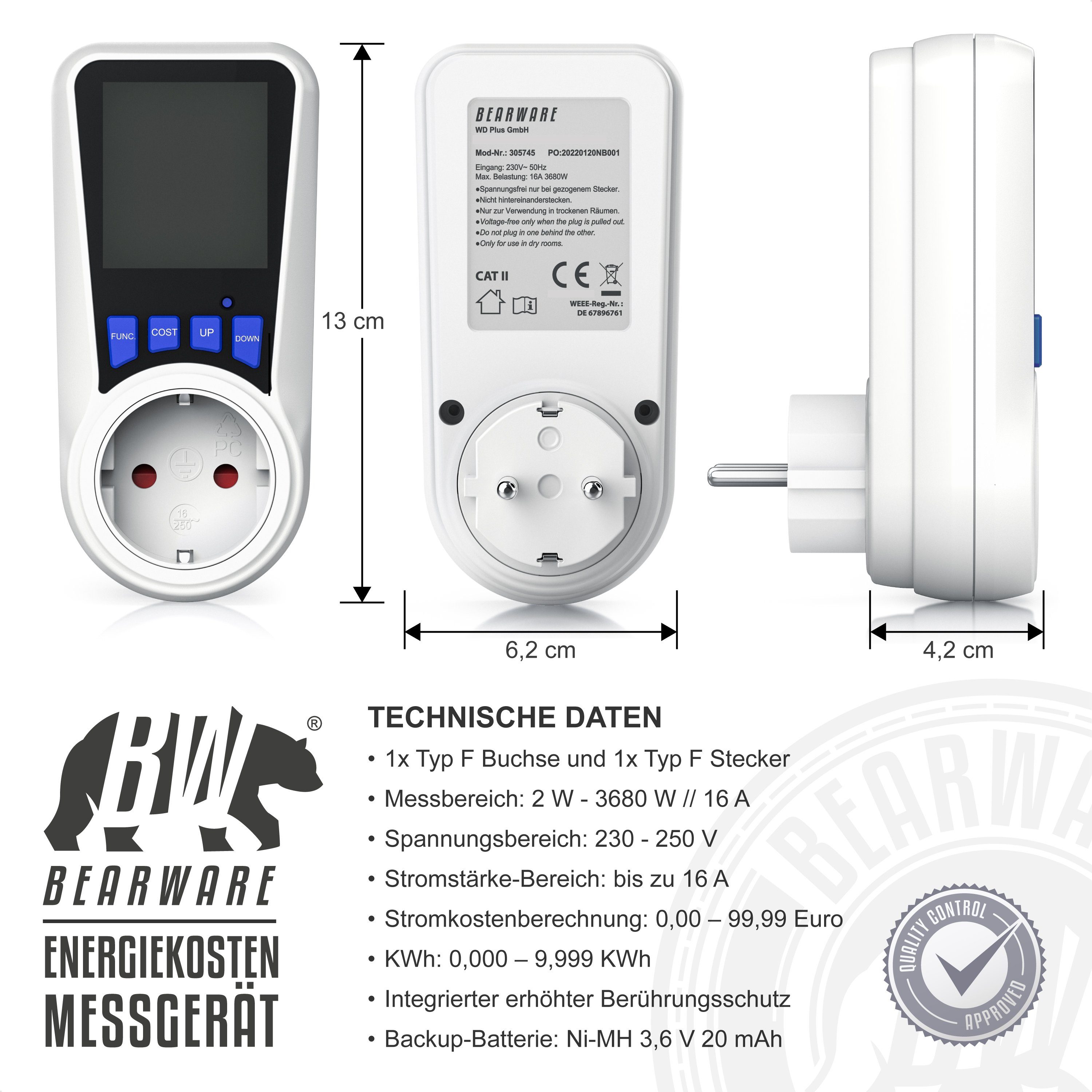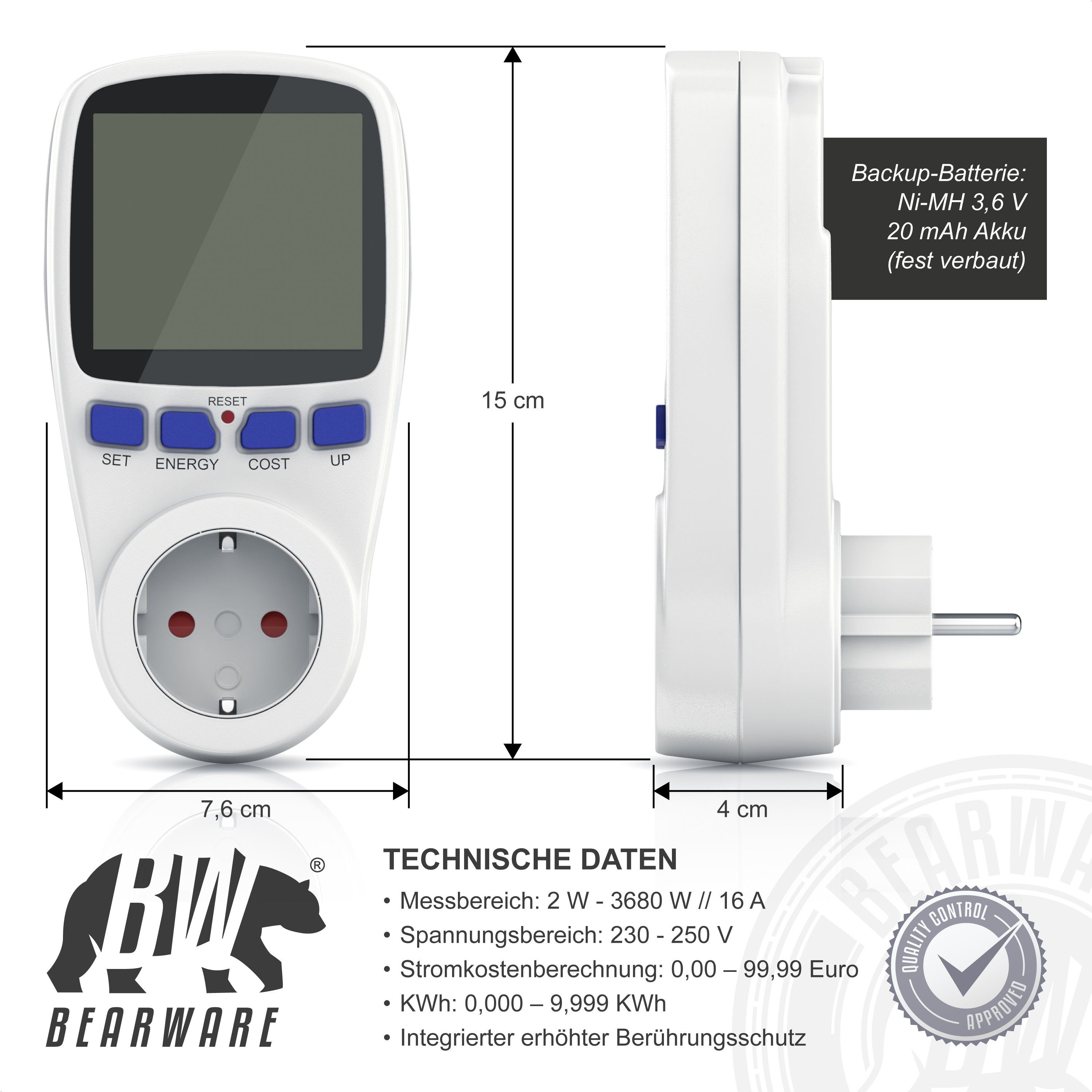 Finde heraus, welche Geräte richtig Strom fressen! Dieses praktische Energiekostenmessgerät zeigt dir genau, wie viel Energie deine Haushaltsgeräte verbrauchen. Bis zu 3680W Belastung, mit Überlastungsalarm für Sicherheit. Das klare Display zeigt kWh und Kosten an. Mit 4 großen Tasten einfach zu bedienen. Perfekt um Stromfresser zu identifizieren und Geld zu sparen. Einfach zwischen Steckdose und Gerät stecken - schon siehst du den Verbrauch!