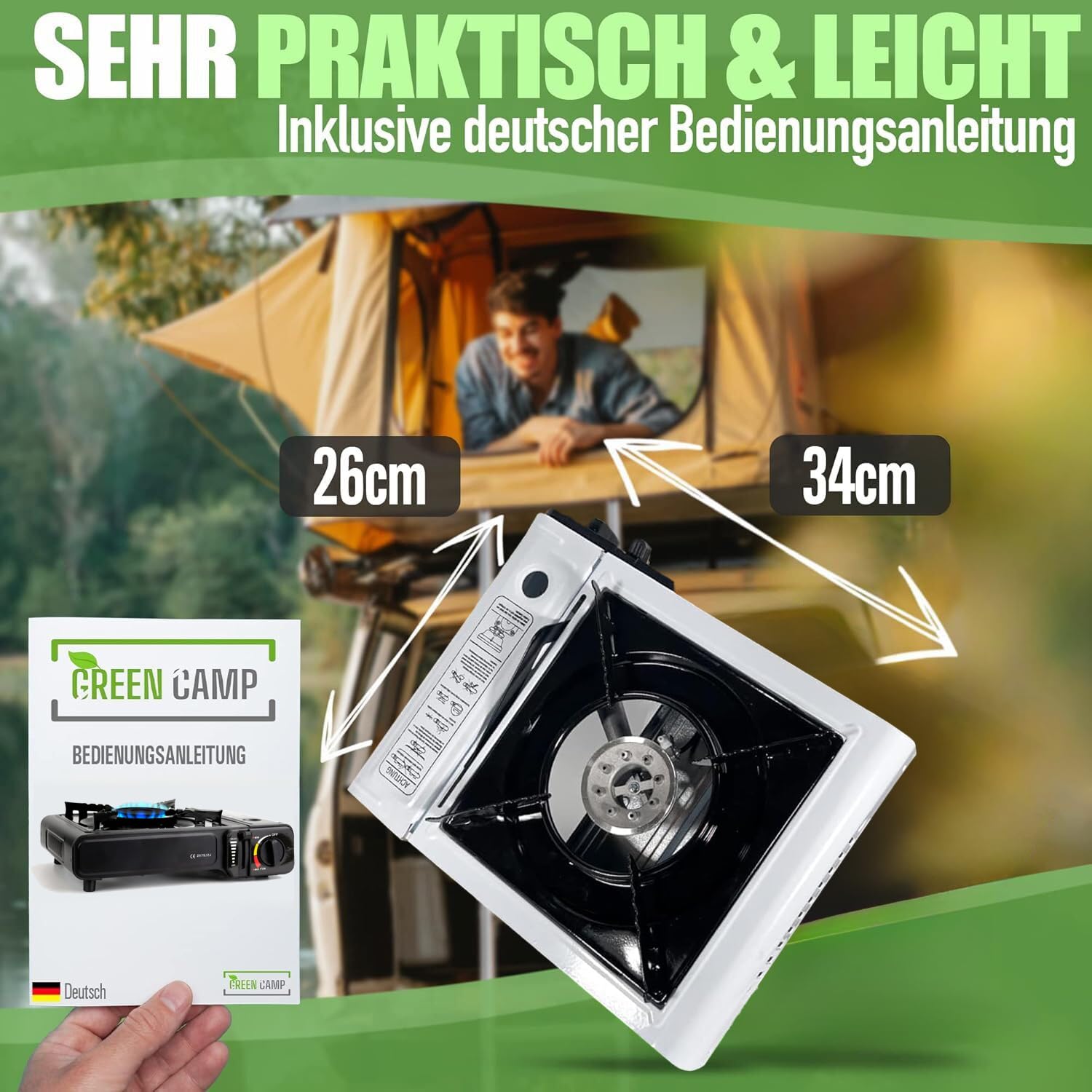 Camping ohne guten Kocher? Undenkbar! Der Green Camp Gaskocher mit Piezozündung macht das Kochen in der Natur zum Vergnügen. Im Lieferumfang sind gleich 16 Gaskartuschen à 227g enthalten - da musst du erstmal nicht nachkaufen! Die stufenlos regulierbare Flamme ermöglicht dir perfektes Kochen, vom einfachen Wasser kochen bis zum aufwändigeren Gericht. Die Piezozündung ist super praktisch - kein Gefummel mit Feuerzeug oder Streichhölzern mehr! Einfach Knopf drücken und schon brennt die Flamme. Robust, kompakt und ideal für unterwegs passt der Kocher in jedes Gepäck. Ob beim Camping, auf Festivals oder beim Tagesausflug - mit diesem Kocher bist du immer bestens ausgerüstet. Einfach aufschrauben, anzünden und loskochen - mehr Komfort beim Outdoor-Kochen geht kaum!