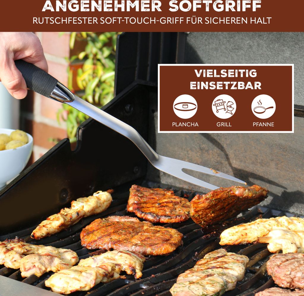 Der unverzichtbare Helfer für jeden Grillmeister! Diese massive Grillgabel aus hochwertigem Edelstahl ist 30cm lang und perfekt zum Wenden und Servieren von Fleisch. Der rutschfeste Schwarz-Griff aus ABS-Kunststoff liegt sicher in der Hand. Mit 3-Punkt-Vernietung für maximale Stabilität. Vielseitig einsetzbar in Küche und am Grill. Spülmaschinengeeignet für einfache Reinigung. Ob Steak, Braten oder Geflügel - mit dieser Gabel meisterst du jede Grill-Session. Profi-Qualität für Hobby-Griller!