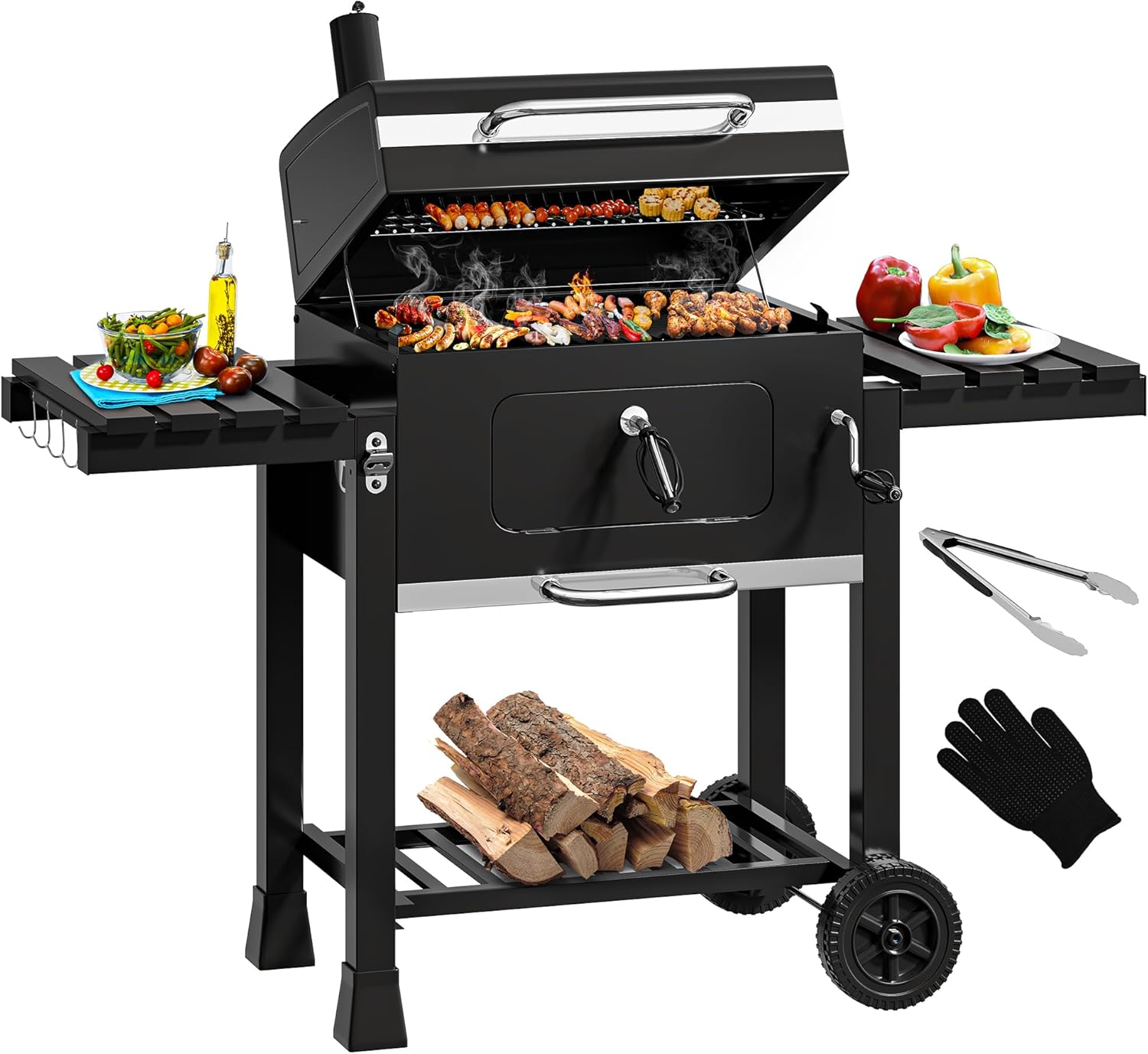 Der mobile Grillwagen kommt mit isolierten Edelstahl-Ablagen, die deine Beilagen warm halten, und ner praktischen Ascheschublade mit Magnetverschluss. So entfernst du die Asche in wenigen Sekunden. Im Lieferumfang sind schon Grillzange aus Bambus und ein hitzebeständiger Handschuh dabei. Der Aufbau ist dank QR-Code-Montagevideo total einfach. Perfekt für Garten, Camping oder den nächsten Ausflug!