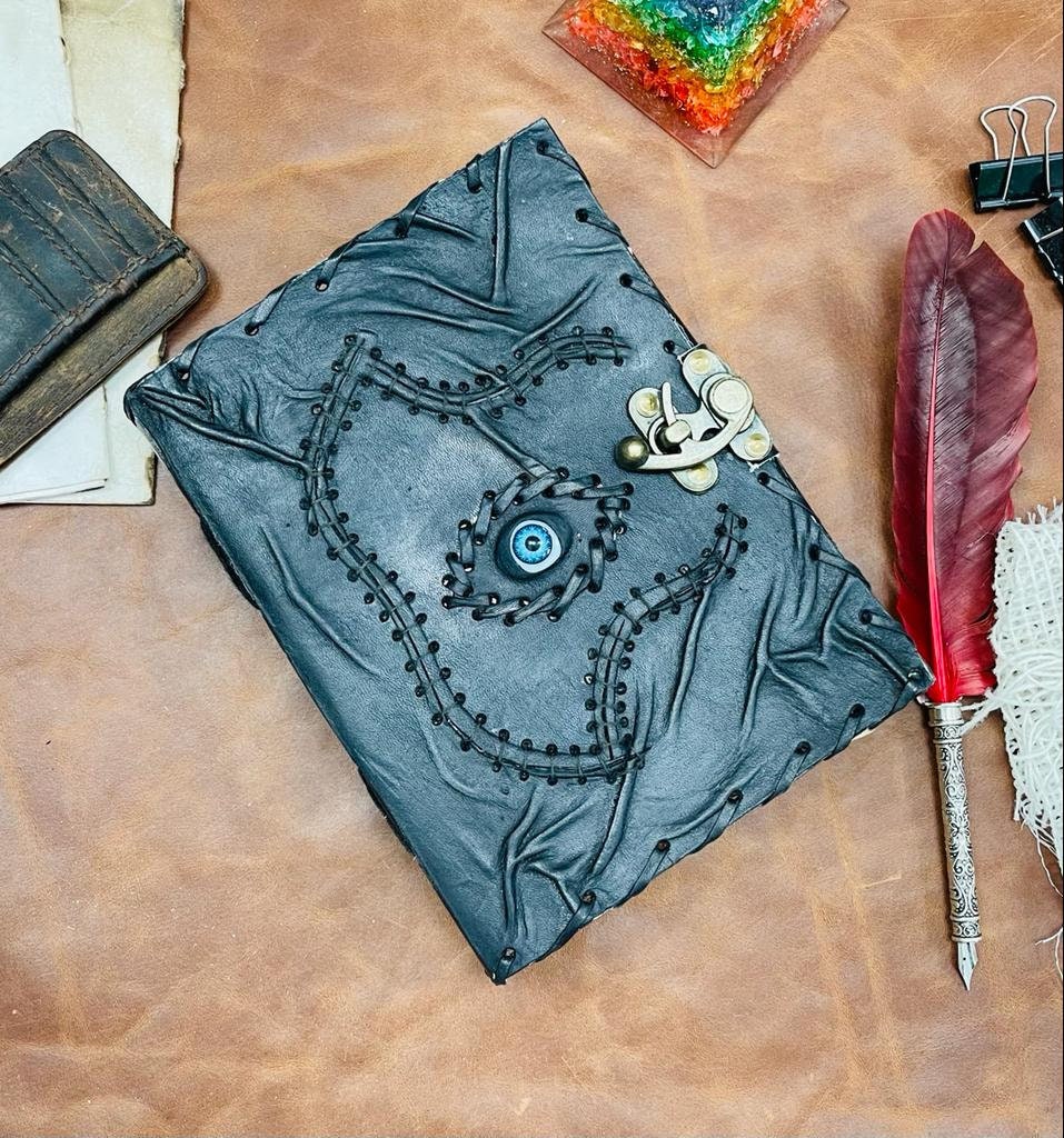 Wow, dieses Buch sieht aus wie direkt aus einem Harry Potter Film! Ein richtig authentisches Zauberbuch aus Leder, das handgefertigt wurde. Das Auge-Symbol auf dem Cover ist nicht nur dekorativ - es steht für die dreifache Göttin in vielen Traditionen.\n\nMit 200 Seiten aus speziellem Büttenpapier hast du genug Platz für alle deine Zaubersprüche, Träume oder Gedanken. Das Papier sieht total alt aus und fühlt sich auch so an - richtig mystisch!\n\nDas coole Schloss sorgt dafür, dass neugierige Blicke draußen bleiben. Deine Geheimnisse bleiben also wirklich geheim! Die Bindung ist handgenäht - da löst sich garantiert kein Blatt raus.\n\nEgal ob du mit Füllfederhalter, Pinselstift oder was auch immer schreiben willst - das Papier hält alles aus ohne durchzulaufen. Mit 3,2cm Dicke ist es schön kompakt für unterwegs.\n\nPerfekt für alle, die was Besonderes suchen - ob als Tagebuch, Skizzenbuch oder einfach als coole Deko. Ein mega Geschenk für alle esoterisch Interessierten oder Fantasy-Fans!