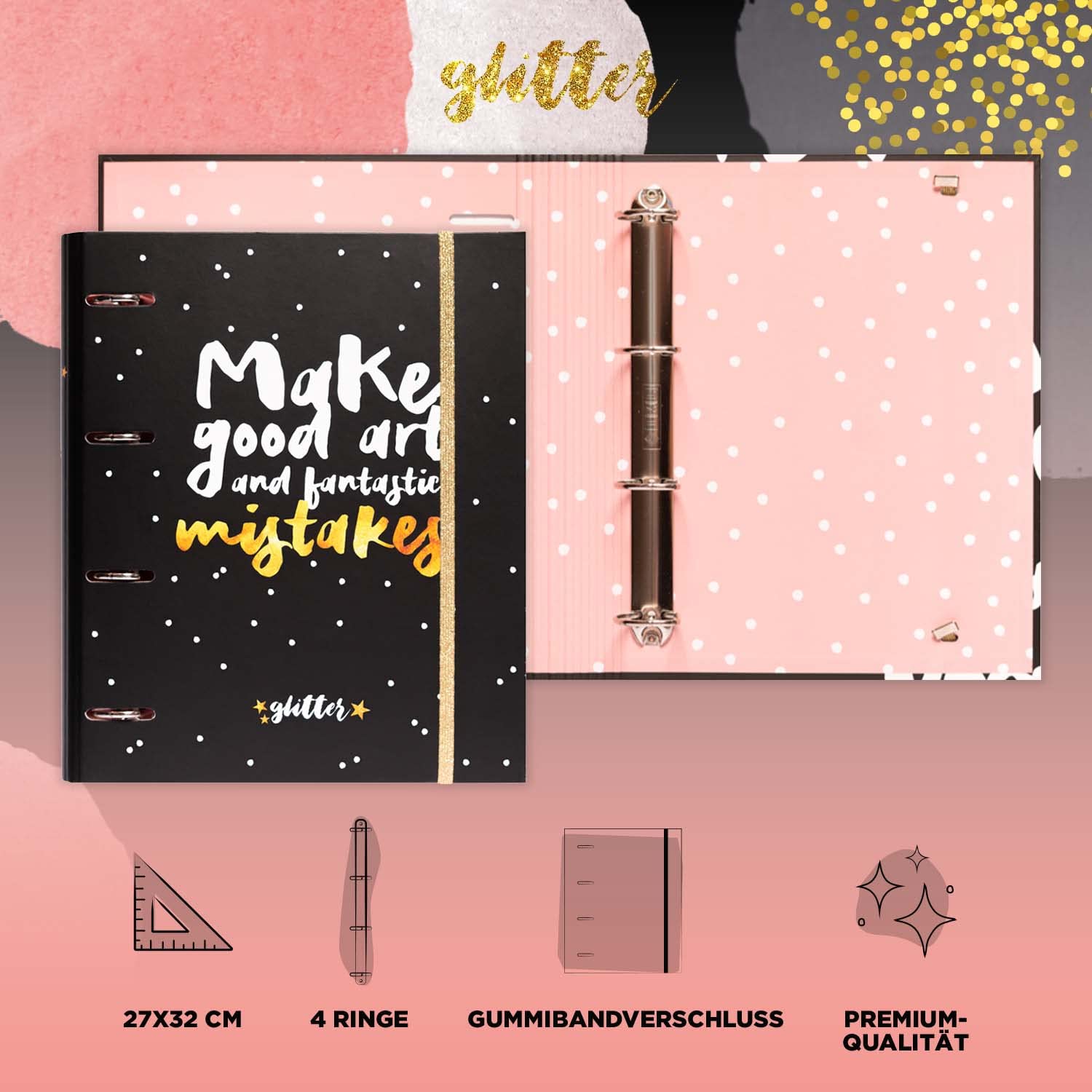 Praktischer A4 Ordner von Grupo Erik - genau das Richtige für Schule, Studium oder Büro! Mit 4 Ringen, hält alles sicher. Schmaler als normale Ordner (32x28x4 cm), passt super in jeden Rucksack oder Tasche. Aus stabilem 2mm Karton, mit coolen Designs die Farbe in den Alltag bringen. Hat ein Gummiband zum Verschließen, damit nichts rausfällt. Ideal für Hefte, Dokumente oder deine kreativen Projekte. Macht auch super als Geschenk zur Einschulung oder fürs Büro. Organisieren war noch nie so stylisch!