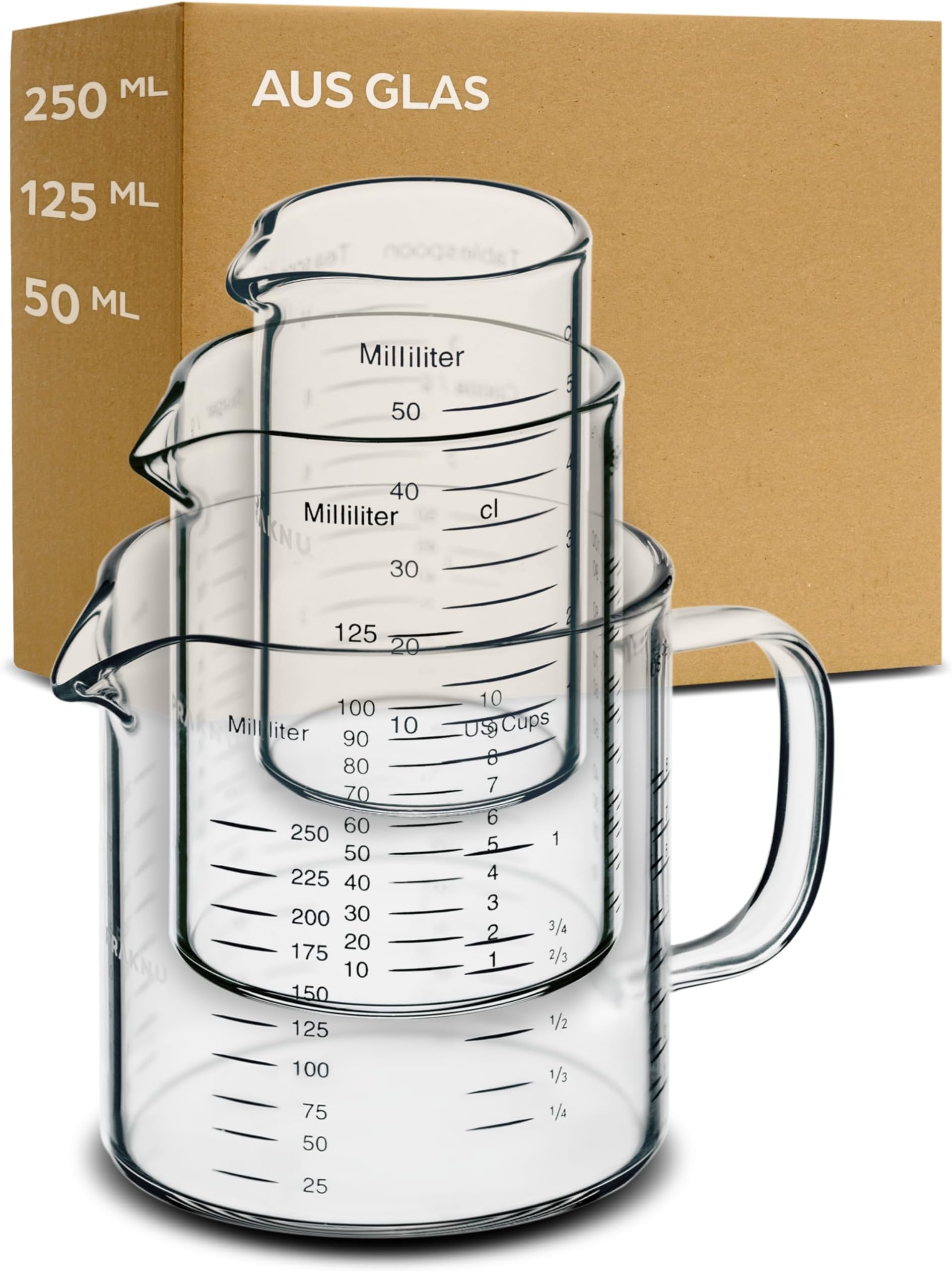 Dieser Messbecher aus Borosilikatglas ist ein echter Alleskönner in deiner Küche! Mit 0,5 Liter Fassungsvermögen und klaren Messskalen von 50-500ml (in 50ml-Schritten) misst du genau ab - ob Wasser, Öl, Mehl oder Milch. Das Besondere: Das Borosilikatglas hält Temperaturen von -22°C bis 302°C aus, ist also backofen- und gefrierfest. Kein Problem, wenn du mal heiße Flüssigkeiten abmessen willst oder den Becher zum Einfrieren verwendest. Der ergonomische Griff liegt super in der Hand und verhindert das Abrutschen. Die dicken Wände machen den Becher stabil und langlebig - kein Zerbrechen wie bei billigen Glas-Messbechern. Perfekt zum Backen, Kochen, Mixen oder für Cocktails. Das klare Glas lässt dich immer genau sehen, wie viel drin ist. Spülmaschinenfest natürlich auch! Ein praktisches Küchenutensil, das du täglich benutzen wirst. Sieht dazu noch schick aus - viel besser als langweilige Plastik-Messbecher. Absolute Kaufempfehlung für alle, die gerne kochen und backen!