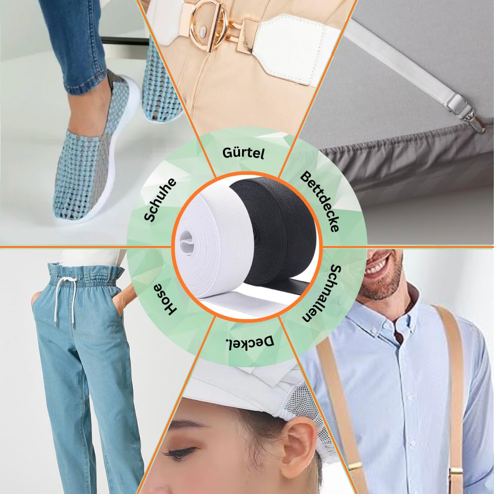 25 Meter Gummiband für alle Näh-Projekte! Aus Polyester und Elasthan - mega dehnbar und reißfest. In verschiedenen Breiten von 10-100 mm erhältlich, in schwarz oder weiß. Perfekt für Taillenbündchen, Sportkleidung oder DIY-Projekte. Weich, flexibel und hautfreundlich. Maschinenwaschbar bei 40°C. Ob für Hosen, Röcke oder Unterwäsche - damit näht sich's einfach besser. Ein Muss in jeder Nähkiste!