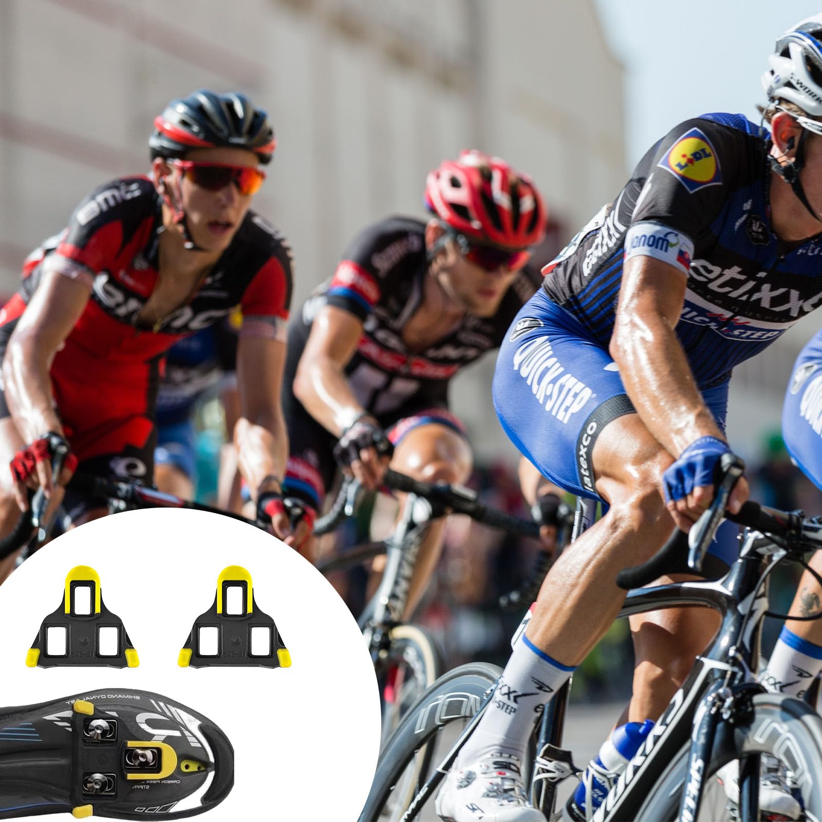 Hey, diese Guyode Cleats sind ein echter Game-Changer für dein Rennrad! Komplett kompatibel mit Shimano SPD SL Systemen wie SM-SH10, SM-SH11 und SM-SH12. Perfekt für alle 3-Bolzen Rennradschuhe. \\n\\nDas besondere Feature: Das 6° Floating-Design! Das bedeutet, dein Fuß kann sich natürlich bewegen während du pedalierst - wie barfuß laufen. Reduziert den Druck auf Knie und Gelenke um satte 30% und steigert deine Effizienz um 15%. Besonders wichtig wenn du länger als eine Stunde unterwegs bist. \\n\\nHergestellt aus Hochleistungskunststoff (Nylon+TPU Mix) und wiegt nur ca. 50g pro Set. Im Lieferumfang ist alles dabei: 2 Cleats, 6 Schrauben, 6 Unterlegscheiben und sogar ein Inbusschlüssel. \\n\\nEinfach montieren - die Anti-Rutsch-Gewinde halten bombenfest. Ob Straßenrennen, MTB oder Indoor-Training - mit diesen Cleats machst du nichts falsch. Deine Knie werden's dir danken!