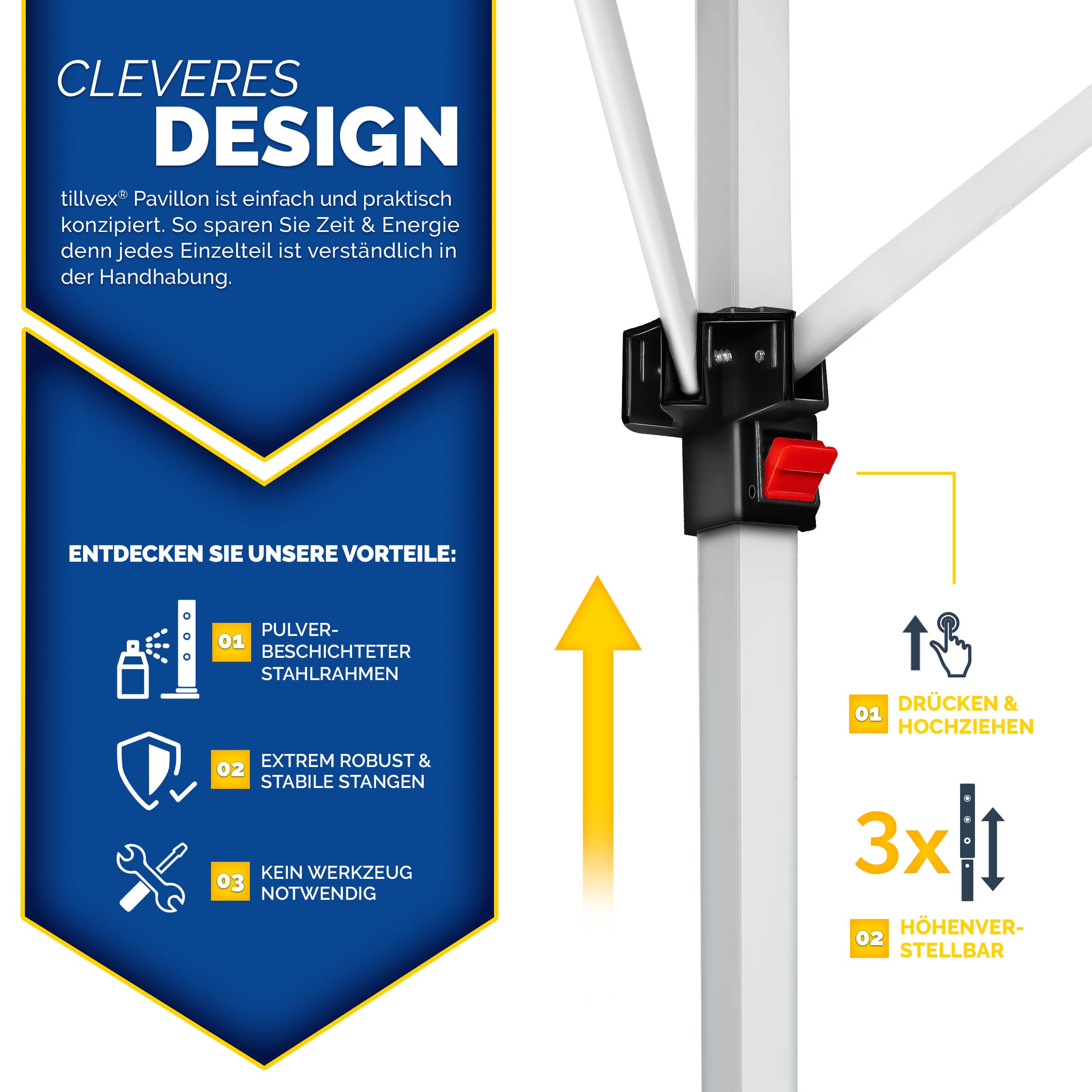 Mit dem praktischen Pop-up-Design ist der Pavillon blitzschnell aufgestellt - ganz ohne Werkzeuge! Die Höhe ist 3-stufig verstellbar (296/306/316 cm), sodass du ihn perfekt an deine Bedürfnisse anpassen kannst.