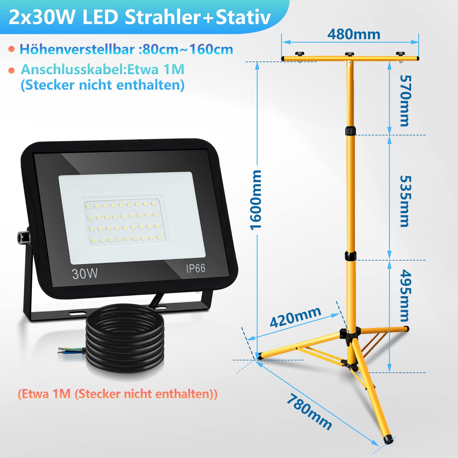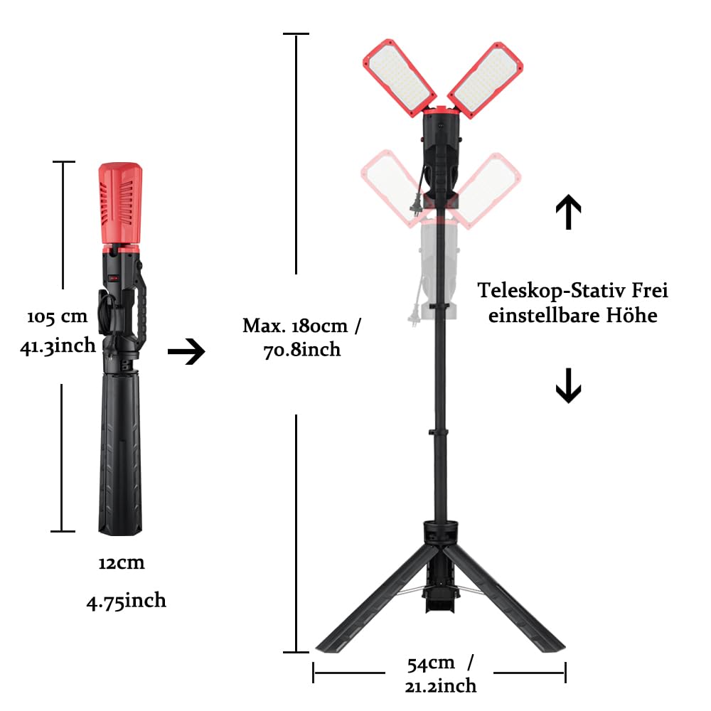 Endlich perfektes Licht auf der Baustelle! Dieser Peviasot LED Baustrahler mit praktischem Stativ ist dein neuer bester Freund bei Renovierungen, in der Werkstatt oder im Garten. Mit zwei starken 50W LED-Köpfen zauberst du satte 5000 Lumen auf die Arbeitsfläche – und das bei sparsamstem Energieverbrauch. Das geniale Stativ lässt sich stufenlos von 60 cm bis 160 cm Höhe verstellen und steht auch auf unebenen Böden bombenfest. Noch mehr Flexibilität? Klar! Die Lampenköpfe schwenken um 180° und drehen sich um 360°, sodass du auch die hintersten Ecken optimal ausleuchten kannst. Mit IP66 Schutz ist die Lampe komplett staub- und wasserdicht – ob bei Regen, Schnee oder in staubigen Werkstätten, sie macht einfach immer mit. Das 3 Meter lange Kabel mit Stecker gibt dir genug Spielraum, und nach getaner Arbeit klappst du das Stativ einfach zusammen und verstaut es platzsparend. Aus robustem Aluminiumdruckguss gebaut, mit exzellenter Wärmeableitung für extreme Langlebigkeit. Perfekt für Baustellen, Garagen, Gärten, Fotostudios – einfach überall, wo du helles, zuverlässiges Licht brauchst!