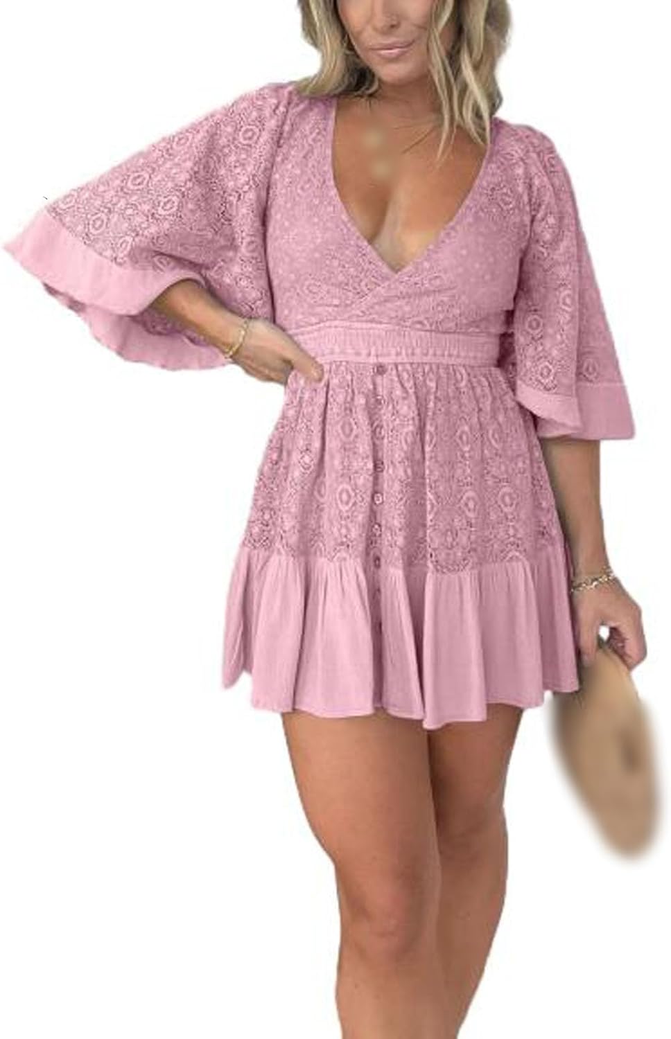 Total trendiges Stramplerkleid für den Sommer! Dieses MKUFT Kleid kombiniert elegante Spitze mit romantischer Häkelarbeit. Mit praktischen integrierten Shorts - super bequem und praktisch! Der weiche Polyester-Elasthan-Mix ist angenehm auf der Haut und passt sich deiner Figur an. A-Linie Schnitt mit hoher Taille betont deine Figur perfekt. V-Ausschnitt vorne und hinten mit süßer Schleife - richtig feminin! Fledermausärmel sorgen für lässigen Comfort. Perfekt für Dates, Partys, Urlaub oder einfach für den Alltag. Einfach anziehen und strahlen - dieses Kleid macht dich zum absoluten Hingucker! In verschiedenen Größen erhältlich.