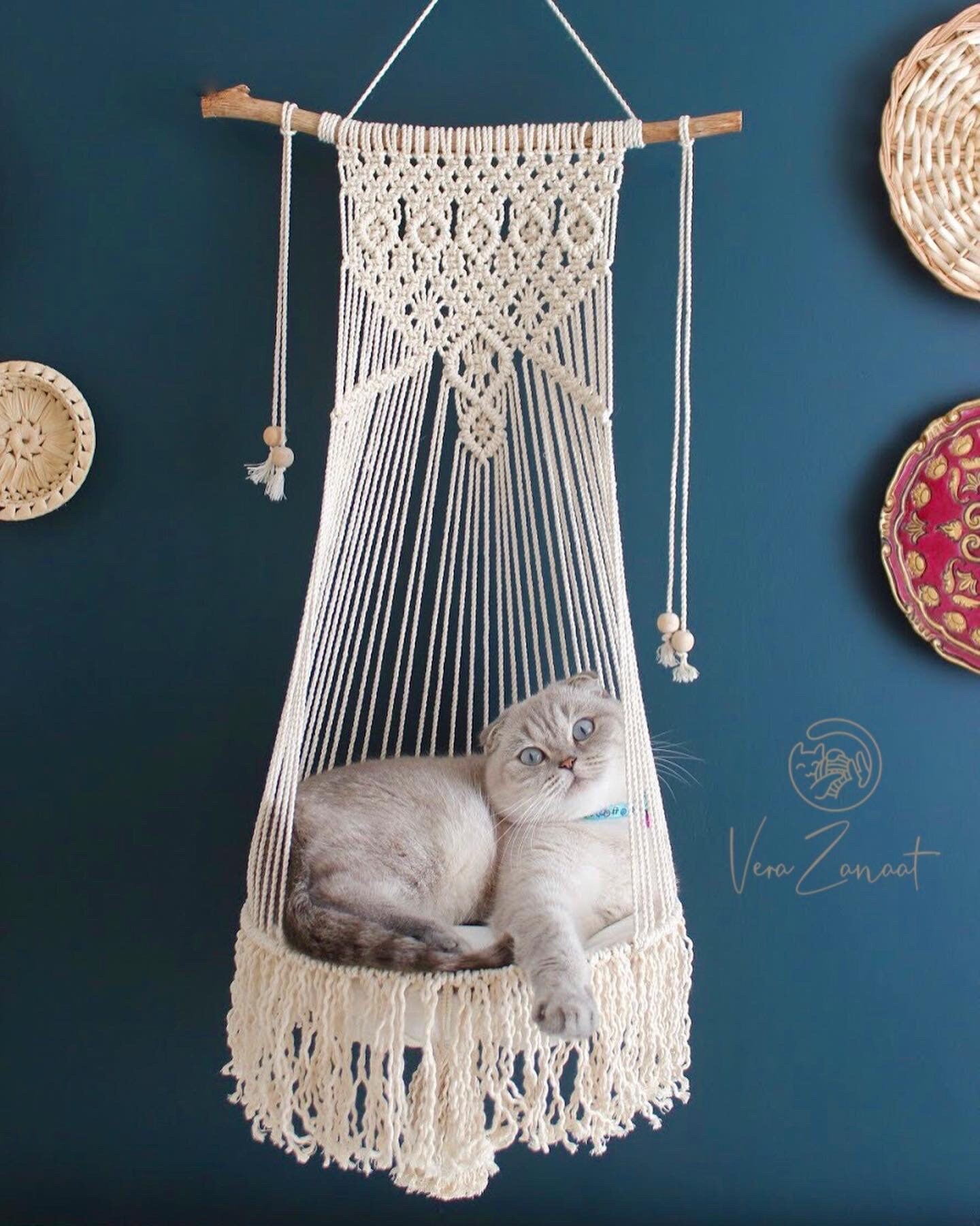 Deine Katze wird's lieben! Diese süße runde Hängematte in Beige ist der perfekte Ruheplatz für deine Samtpfote. Handgewebt aus Baumwollseil im Boho-Style, mit 40cm Durchmesser ideal für kleine Katzen und Hunde bis 3kg. Einfach aufhängen und dein Tier kann entspannen, schlafen oder die Aussicht genießen. Perfekt für drinnen und draußen. Der erhöhte Rand gibt Sicherheit und Gemütlichkeit. Einfach zusammendrücken zum Transport oder Lagerung. Schenk deinem Liebling diesen kuscheligen Rückzugsort - er wird stundenlang darin dösen und träumen!