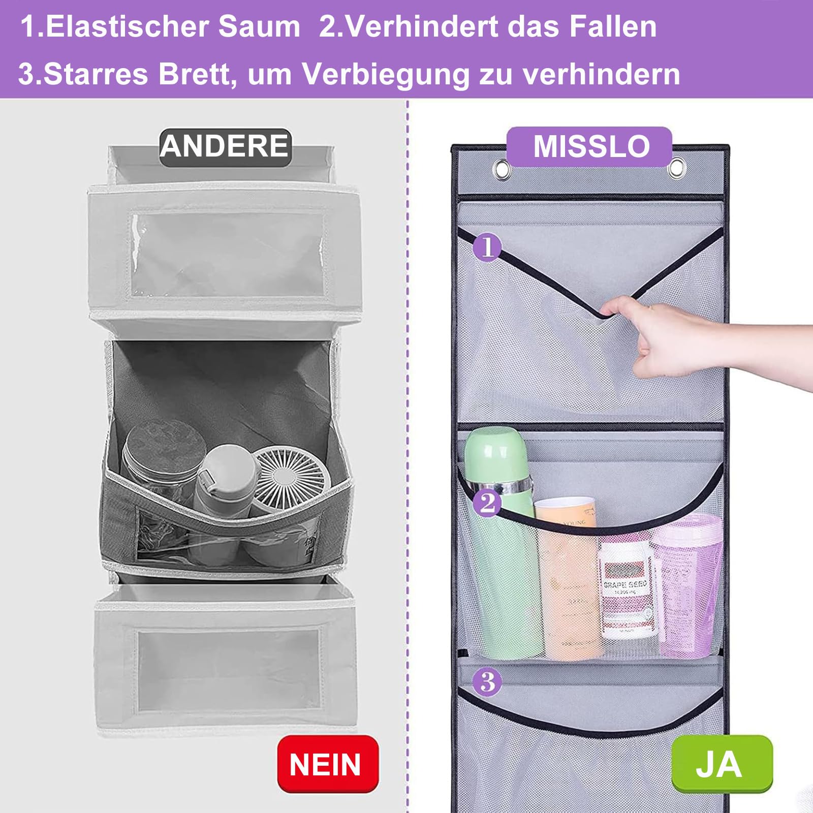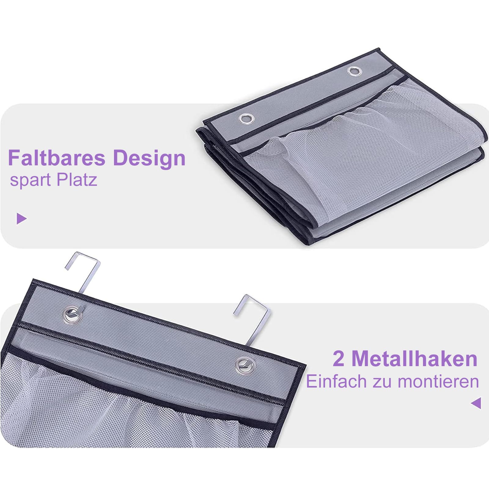 Platzprobleme? Dieses praktische Hängeregal mit 5 geräumigen Netztaschen schafft Abhilfe! Einfach über die Tür gehängt und schon hast du jede Menge Stauraum für Spielzeug, Badutensilien oder Accessoires.\\n\\n• 5 große Fächer (je 32x20 cm)\\n• Atmungsaktives Mesh-Material\\n• 2 stabile Edelstahl-Haken\\n• Passt auf Türen bis 5 cm Dicke\\n• Gesamtmaße: 32x130 cm\\n\\nPerfekt fürs Kinderzimmer, Badezimmer oder den Kleiderschrank. Sieh auf einen Blick, wo was liegt und finde alles blitzschnell. Das robuste Oxford-Gewebe hält auch schwerere Sachen problemlos aus.\\n\\nEinfach aufhängen - keine Montage nötig! Die neutral-graue Farbe passt zu jedem Einrichtungsstil. Endlich mehr Ordnung ohne Bohren oder Schränke zu kaufen. Deine Tür wird zum praktischen Stauraum-Wunder!