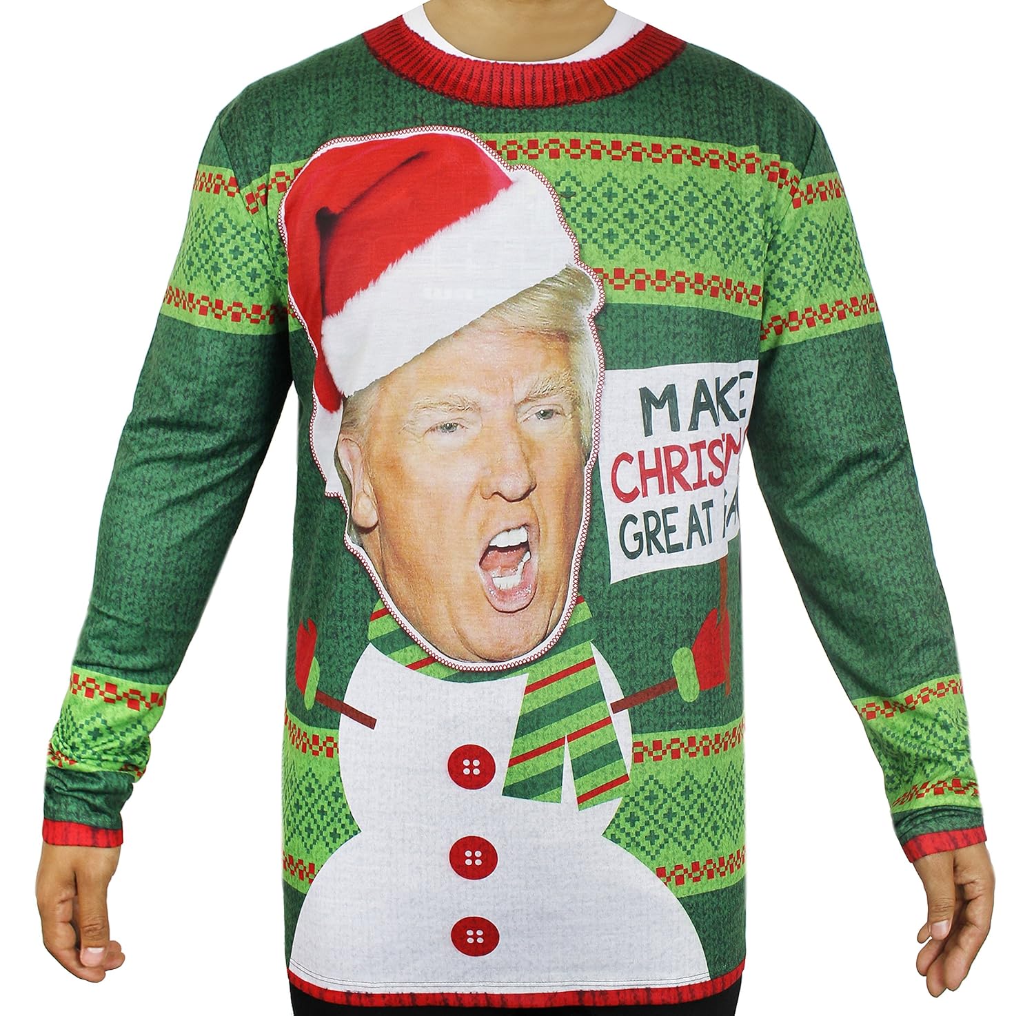 Der ultimative Ugly Christmas Sweater für alle Trump-Fans! Mit dem lustigen Aufdruck 'Make Christmas Great Again' und Donald Trump in Nikolausmütze sorgst du garantiert für Lacher auf jeder Weihnachtsfeier. Perfekt für die Weihnachtsfeiertage, Weihnachtsmärkte oder als Geschenk für politisch interessierte Freunde. Der Pullover besteht aus angenehmem 50% Baumwolle/50% Polyester Gemisch und wiegt 236 Gramm - nicht zu dick, nicht zu dünn, einfach perfekt für gemütliche Wintertage. Mit gerippten Ärmelbündchen für optimalen Sitz. Der hochwertige Aufdruck hält dank Wärmebehandlungsverfahren lange. In Ugly Christmas Look - je hässlicher, desto besser! Mach dieses Weihnachten unvergesslich mit diesem einzigartigen Sweatshirt.