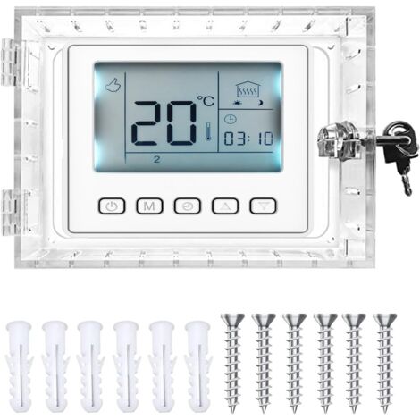 Willst du verhindern dass jemand an deinem Thermostat rumspielt? Diese transparente Schutzbox mit Zahlenschloss ist perfekt! Maße 20x14x5cm - passt für die meisten Thermostate. Aus hochwertigem Acryl das nicht vergilbt oder verblasst. Das Zahlenschloss ist super praktisch - kein Schlüssel der verloren gehen kann, einfach Code einstellen und merken. Einfache Montage: Muss nicht mal den Thermostat von der Wand nehmen, einfach Löcher um das Thermostat stanzen und die Box auf der Seitenwand montieren. Perfekt für Büros, Restaurants, Schulen, Kirchen oder zu Hause wenn Kinder oder unbefugte Personen nicht an die Temperatureinstellungen sollen. Transparentes Design - du siehst trotzdem alle Anzeigen und kannst die Temperatur ablesen. Schützt auch vor Beschädigungen und Staub. Einfache Lösung für mehr Kontrolle über deine Heizungseinstellungen - ob im gewerblichen oder privaten Bereich.