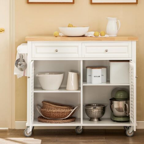 Endlich Ordnung in deiner Küche! Dieser praktische Küchenwagen von HOMCOM ist der absolute Allrounder für jede Küche. Mit den Maßen 111,5x45-75x89cm bietet er genug Stauraum ohne zu viel Platz wegzunehmen. Das besondere Highlight: Die ausziehbare Arbeitsplatte vergrößert sich von 45 auf 75cm - perfekt als zusätzliche Ablagefläche oder kleine Frühstückstheke! Mit 2 Schranktüren und 3 geräumigen Schubladen findest du Platz für Gewürze, Geschirr, Handtücher und alles was in der Küche so anfällt. Die 4 Rollen mit Feststellern machen ihn super mobil - schieb ihn einfach dorthin, wo du ihn gerade brauchst. Aus robustem MDF und Gummiholz gefertigt - stabil und langlebig. Belastbar bis 50kg - da kannst du getrost auch schwere Küchengeräte draufstellen. Einfacher Zusammenbau mit beiliegender Anleitung. Perfekt nicht nur für die Küche, sondern auch als Servierwagen im Wohnzimmer oder als praktischer Aufbewahrungsschrank im Home-Office. Das weiße Design mit natürlichen Holzakzenten passt zu fast jedem Einrichtungsstil. Mach deine Küche effizienter und stylischer - dieser Küchenwagen wird dein neuer Liebling!