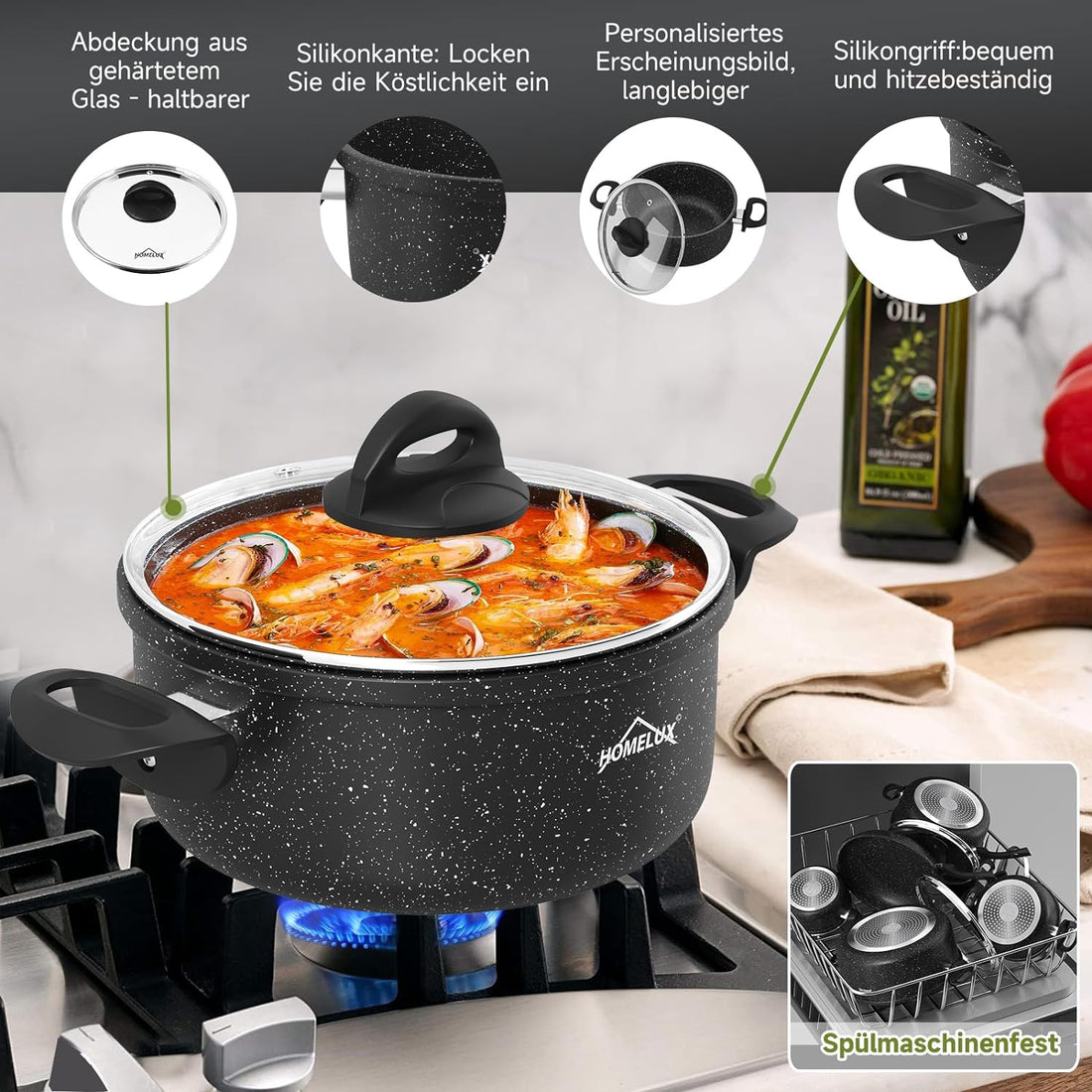 Koche wie ein Profi mit diesem 10-teiligen Kochgeschirr-Set von HOMELUX! Enthalten ist alles, was du für den Küchenalltag brauchst: Soßenpfanne 16cm mit Deckel, drei Kasserollen (20cm, 24cm, 28cm) jeweils mit Deckel, und zwei Bratpfannen (24cm und 28cm). Aus robustem Aluminiumguss mit 3 mm Stärke heizt sich das Set schnell auf und verteilt die Hitze super gleichmäßig - das spart Energie und sorgt für perfekte Kochergebnisse. Die Keramik-Antihaftbeschichtung innen bedeutet: Kein Anbrennen, weniger Fett benötigt und super leicht zu reinigen. Kompatibel mit allen Herdarten - Induktion, Gas, Elektro, Keramik, du name it! Die stabilen Glasdeckel mit Dampfabzug ermöglichen dir, den Kochfortschritt im Auge zu behalten, ohne den Deckel anheben zu müssen. Robuste, ergonomische Griffe sorgen für sicheren Halt. Wichtig zur Pflege: Am besten per Hand waschen mit warmem Wasser und mildem Spülmittel, dann hast du lange Freude an den Töpfen. Ein richtig tolles Set für alle, die gerne kochen und Wert auf Qualität legen!