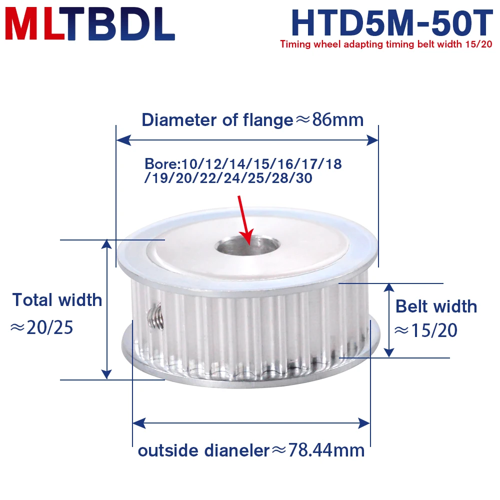 Professionelle Zahnriemenscheibe für präzise Kraftübertragung! Mit 50 Zähnen und 5mm Teilung ideal für verschiedene industrielle Anwendungen. Der Außendurchmesser beträgt 78,44mm, und du kannst zwischen verschiedenen Bohrungen von 8-25mm wählen.