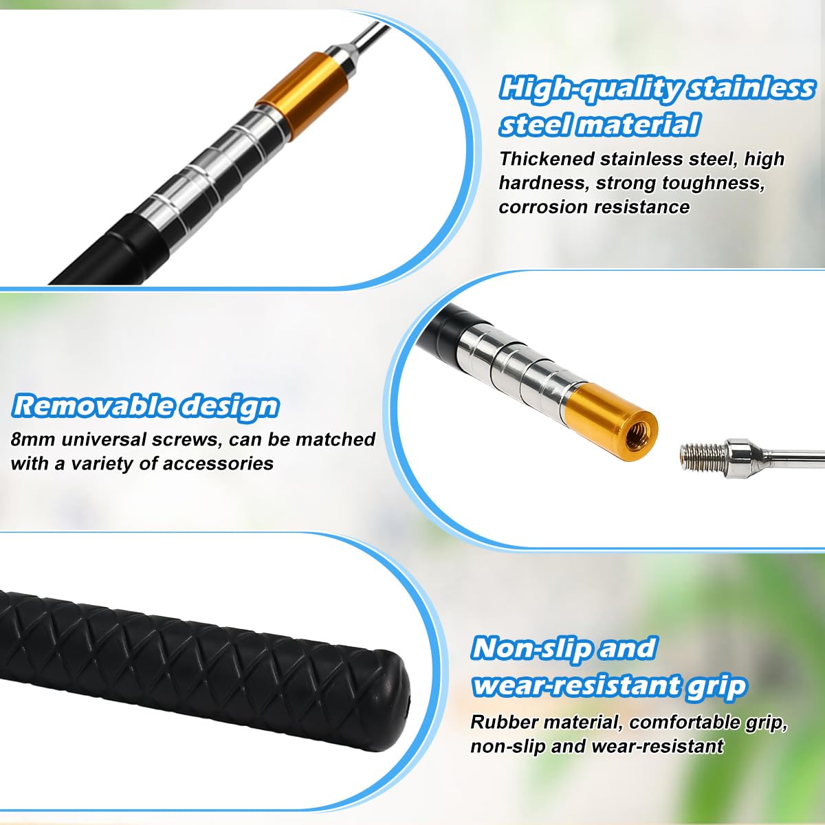 Diese vielseitige Teleskopstange ist dein neuer bester Helfer für Haus und Garten! Aus hochwertigem Edelstahl gefertigt, ist sie robust und langlebig. Der speziell geformte Haken am Ende eignet sich perfekt für Bodentreppen, Sonnensegel mit Kederleiste oder andere schwer erreichbare Aufgaben. Die teleskopierbare Konstruktion ermöglicht flexible Längenanpassung - so erreichst du auch hohe oder unzugängliche Stellen problemlos. Der ergonomische Griff mit rutschfester Textur liegt sicher in der Hand, auch bei längerer Benutzung. Perfekt für die Reinigung von Poolrändern, das Bedienen von Markisen oder als praktischer Mehrzweckhelfer in Werkstatt und Garten. Die Arretierung sorgt für stabilen Halt in jeder Position. Die schwarze Griffbeschichtung sieht nicht nur professionell aus, sondern verbessert auch den Griff. Ein unverzichtbares Tool für jeden Hausbesitzer und Hobby-Gärtner! Einfach ausziehen, arretieren und loslegen - so einfach geht's!