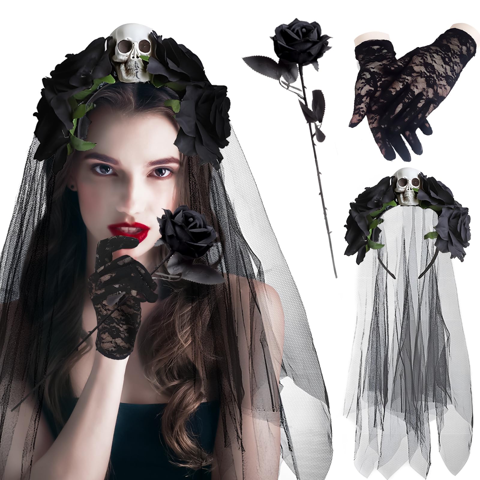 Wow, dieses Gothic-Schleier-Set von RosyFate ist einfach perfekt für dein nächstes Halloween-Outfit! Der schwarze Schleier mit der gruseligen Totenkopf-Verzierung und den dunklen Rosen sieht einfach mega aus und verwandelt dich sofort in eine geheimnisvolle Geisterbraut.