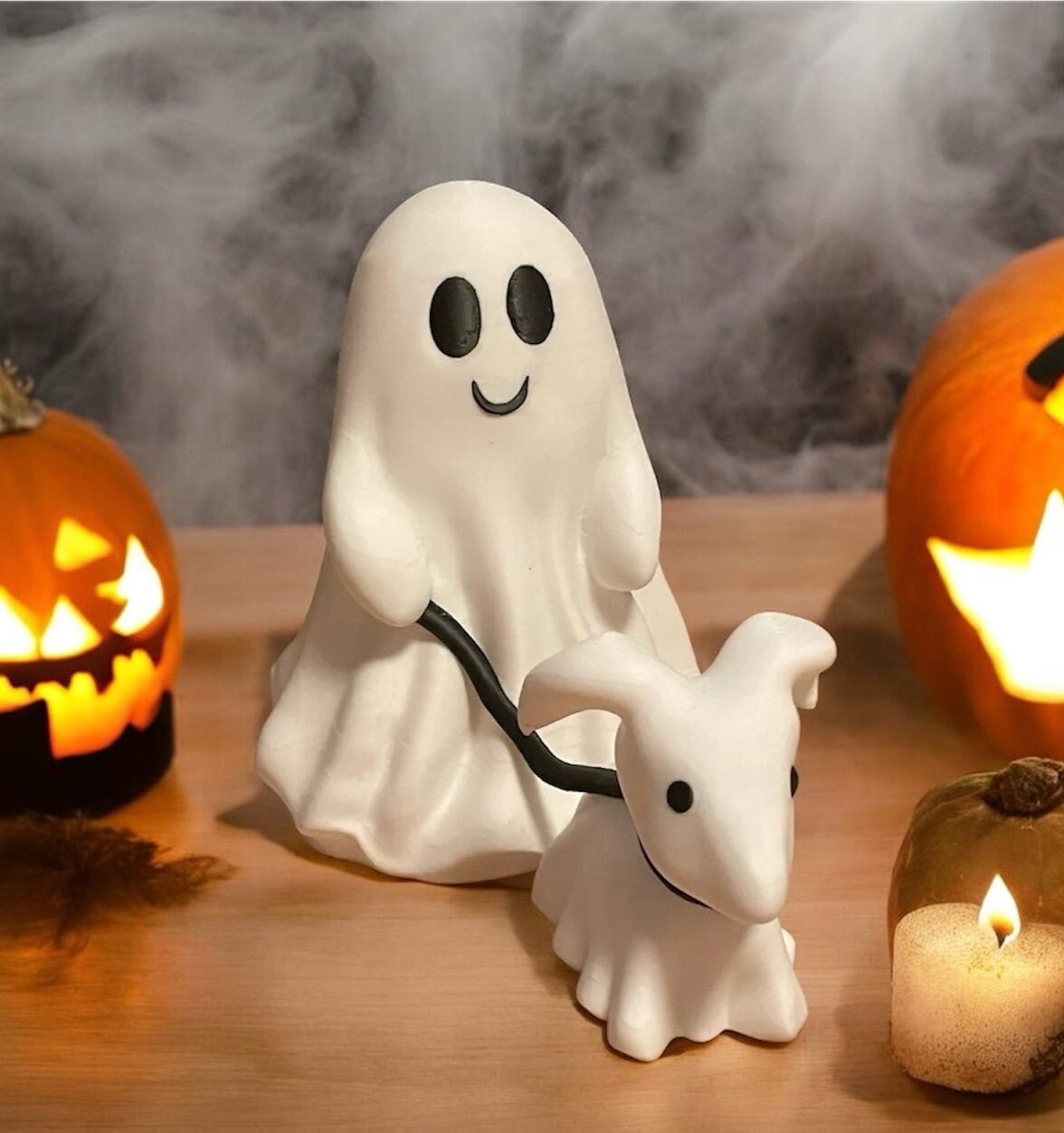 Diese bezaubernde Geist-mit-Hund Figur ist perfekt für Halloween und die Herbstzeit! Aus hochwertigem Harz gefertigt, ca. 20cm hoch. Der süße Geist führt seinen Hund spazieren - ein skurril-lustiges Design das Schmunzeln garantiert. Perfekt als Tischdekoration im Wohnzimmer, auf der Kommode oder im Regal. Auch draußen im Garten oder auf der Terrasse ein Hingucker. Verspieltes Detail für landhausstilige Einrichtungen. Schafft sofort gemütliche Herbst-Atmosphäre. Ein Muss für Hundeliebhaber und Halloween-Fans!