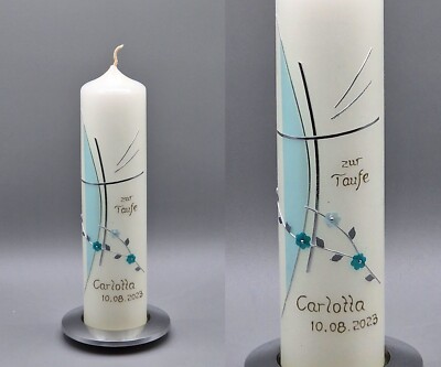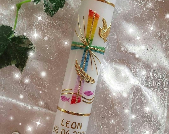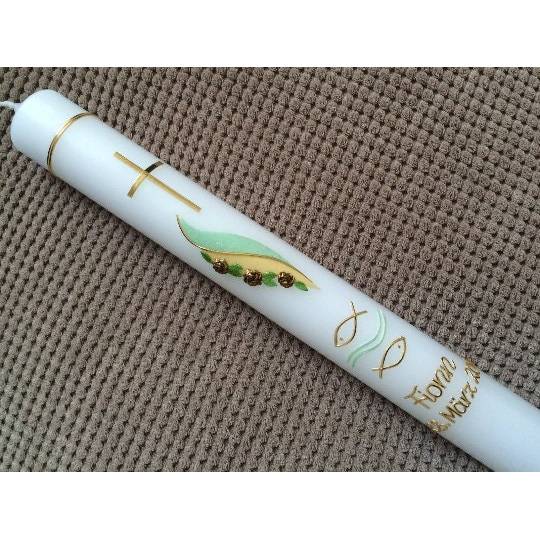 Ein bleibendes Erinnerungsstück für besondere Momente! Diese wunderschöne Tauf- oder Kommunionkerze wird in Handarbeit gefertigt und kann mit Namen, Datum und Anlass personalisiert werden. Ca. 40cm hoch und 3,5cm breit in eleganter weiß-goldener Optik. Hergestellt in der EU - keine China-Importware. Jede Kerze ist ein Unikat. Perfekt für Taufe, Erstkommunion, Firmung oder andere festliche Anlässe. Nach Bestellung bitte Personalisierungswünsche per Email mitteilen. Ein Geschenk, das noch Jahre später Freude bereitet und an den besonderen Tag erinnert. Qualität die man sieht und schätzt!