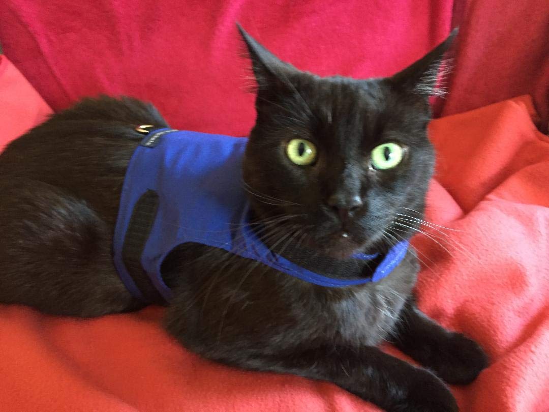 Für ausgewachsene Katzen mit Brustumfang von 12-20 cm. Handgefertigt aus schwarzer Baumwolle, dreifach vernäht und maschinenwaschbar. Mit langen Klettverschlüssen für Hals und Brust, sowie einem supersicheren Stahl-D-Ring für die Leine.
