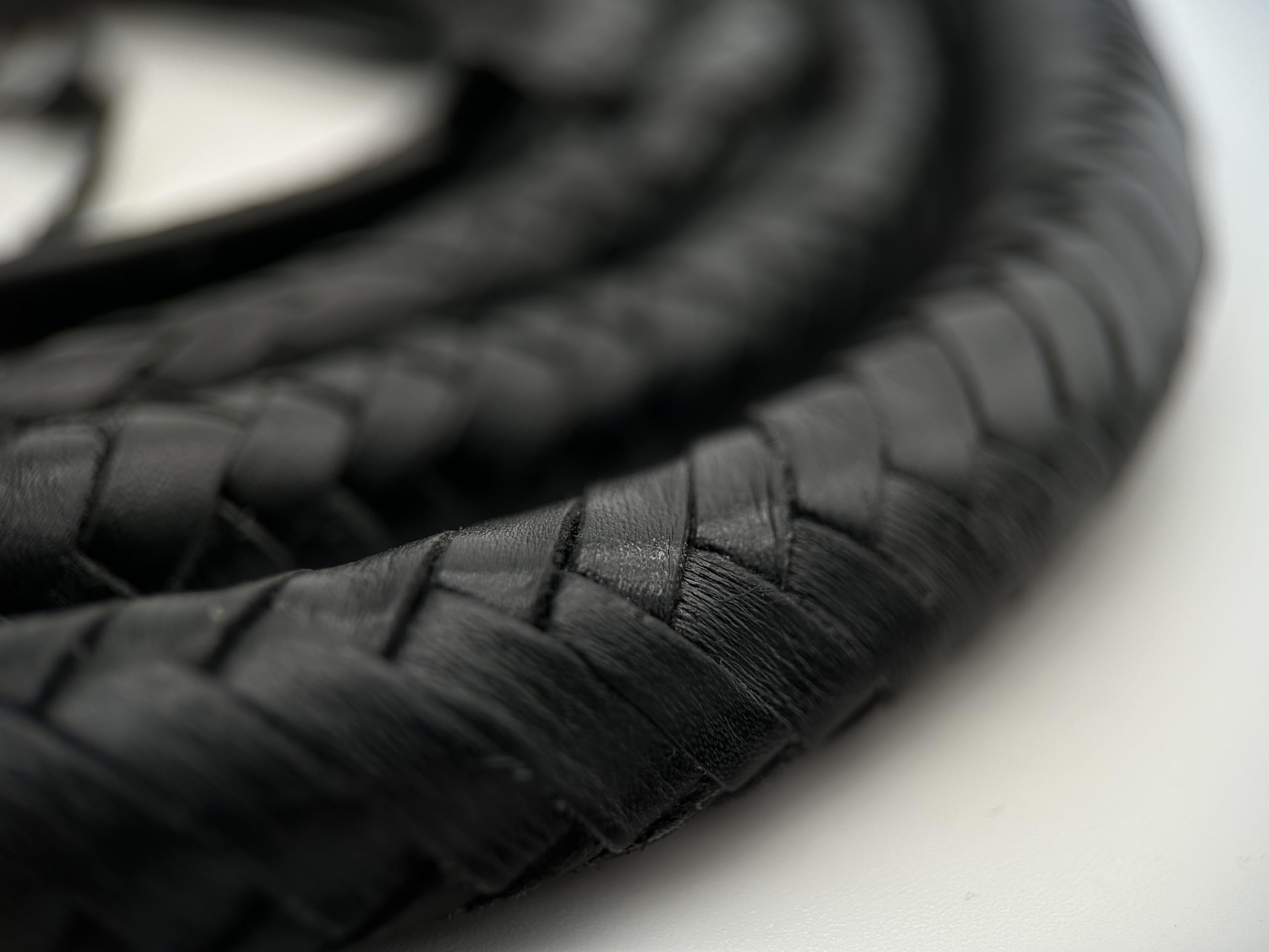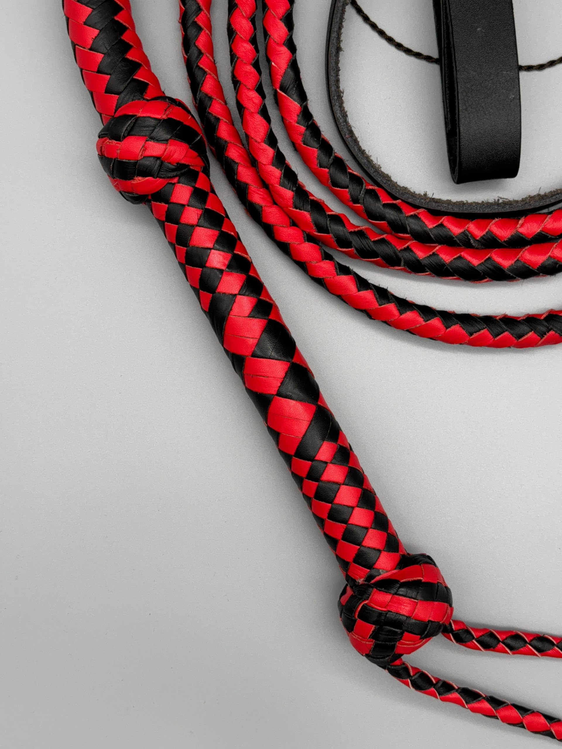 Diese beeindruckende Bullenlederpeitsche ist ein echtes Handwerksstück! Mit stolzen 244 cm (8FT) Länge und in klassischem Schwarz ist sie sowohl funktional als auch dekorativ. Handgeflochten aus 12 Zöpfen aus hochwertigem Rindsleder - flexibel, langlebig und mit vollem Klatscher.