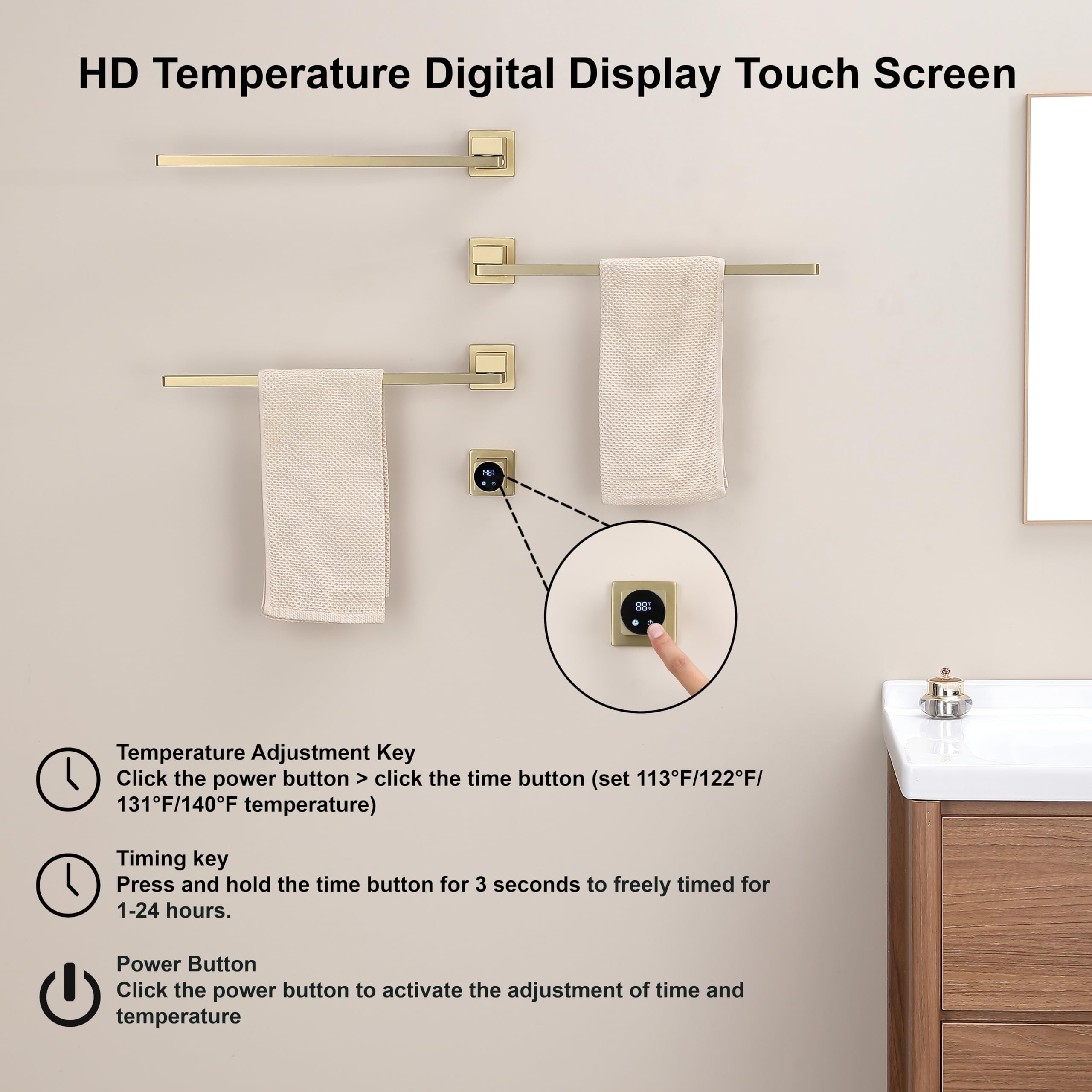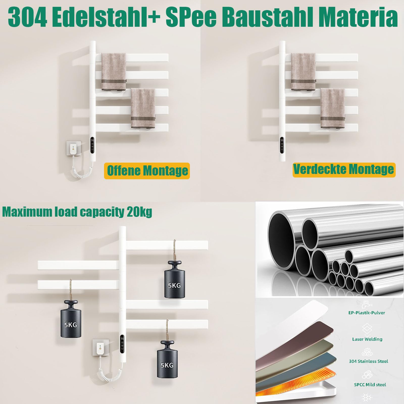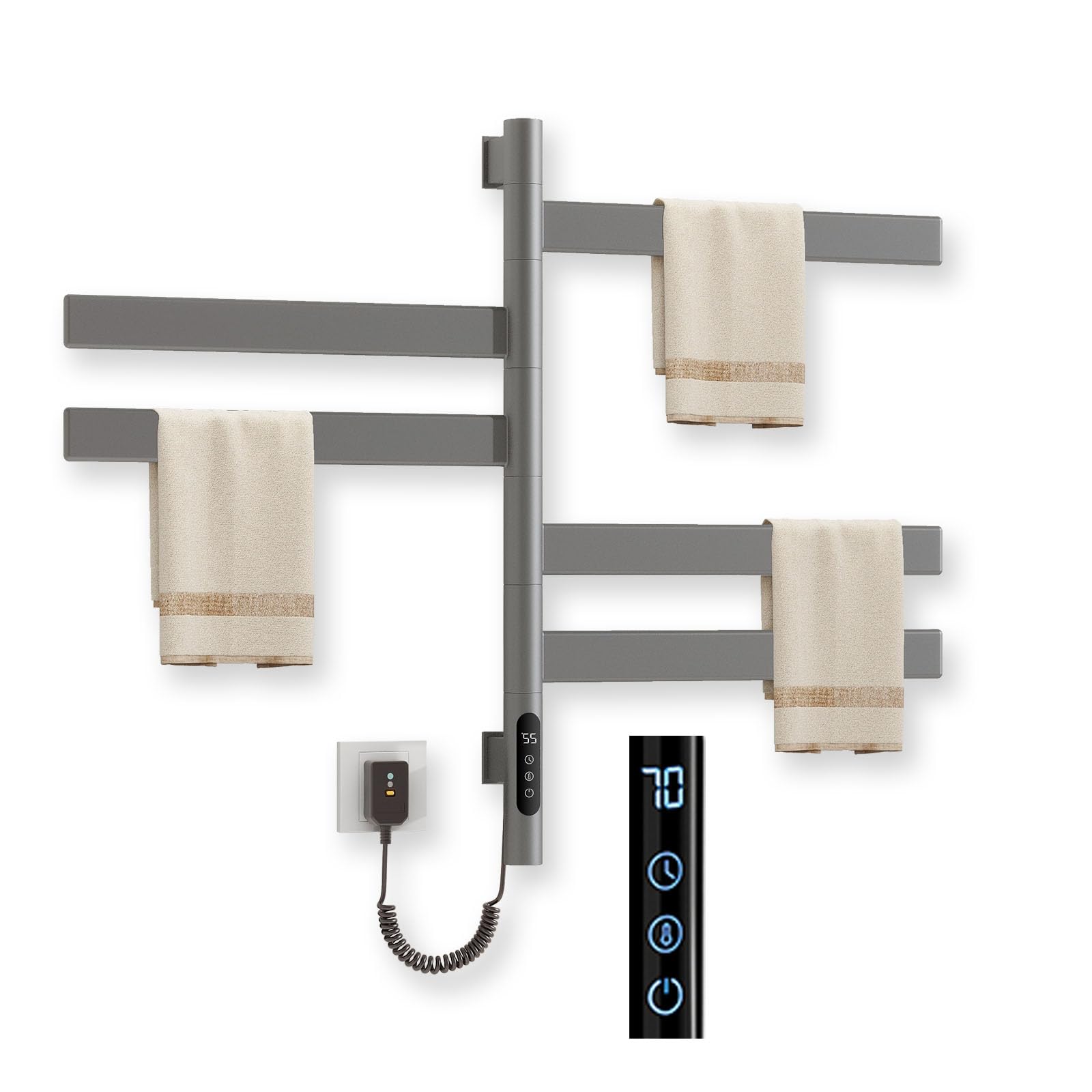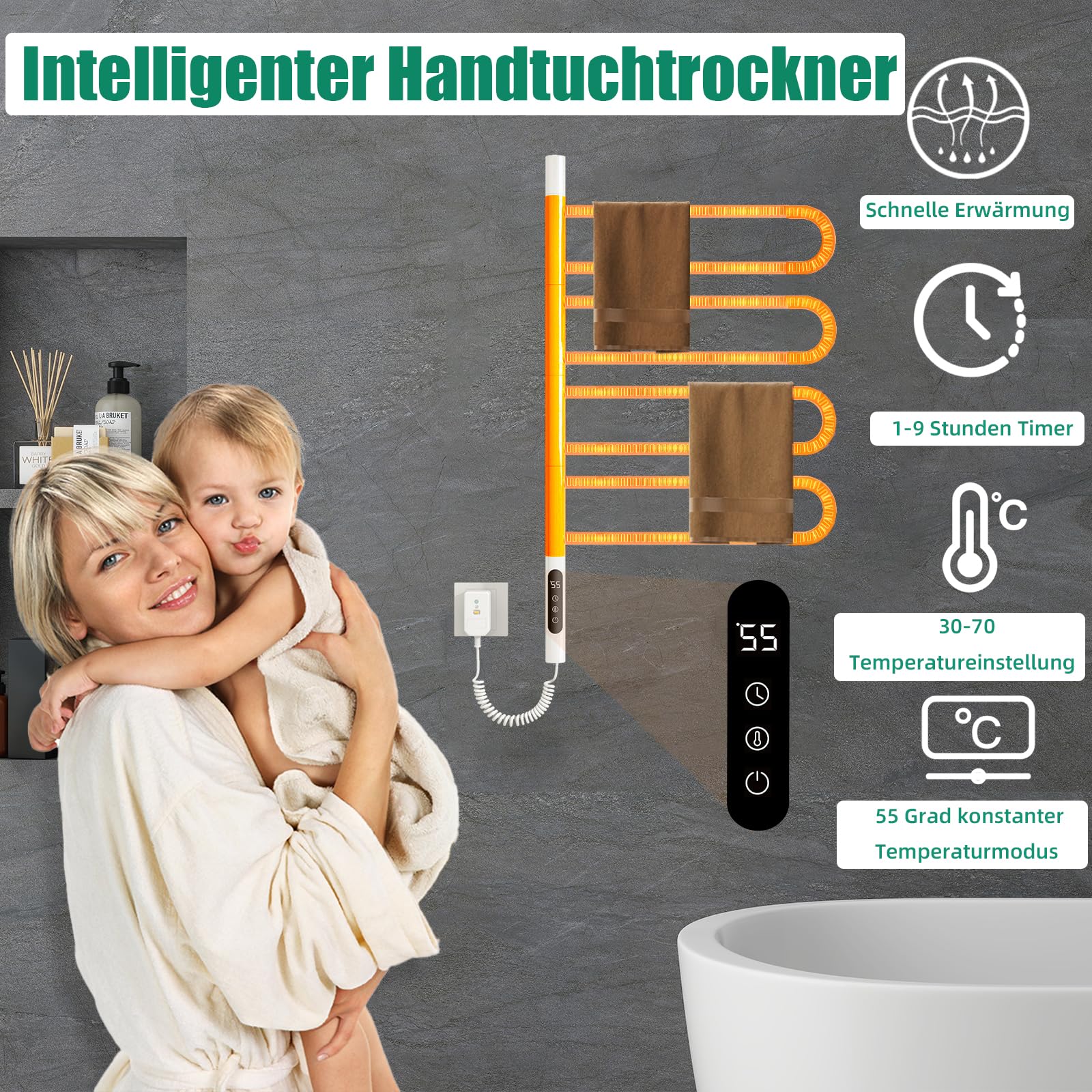 Mach dein Badezimmer zur Wohlfühloase! Der Usknxiu Handtuchheizkörper heizt nicht nur Handtücher, sondern auch den Raum. Mit der LED-Touch-Bedienung stellst du die Temperatur zwischen 30°C und 70°C ein – oder programmierst den Timer von 1 bis 9 Stunden. Das coole Feature: Er lässt sich um 180° drehen, spart also Platz und passt auch in kleine Bäder. Aus stabilem Stahl gefertigt und mit IPX5-Schutz gegen Spritzwasser. Einfach an die Wand montieren, Stecker in die Dose – und schon genießt du kuschelig warme Handtücher nach dem Duschen. Perfekt für Bad, Gäste-WC oder sogar die Küche!