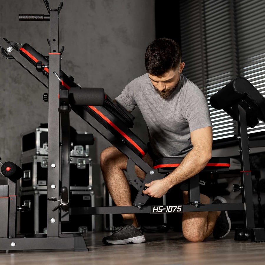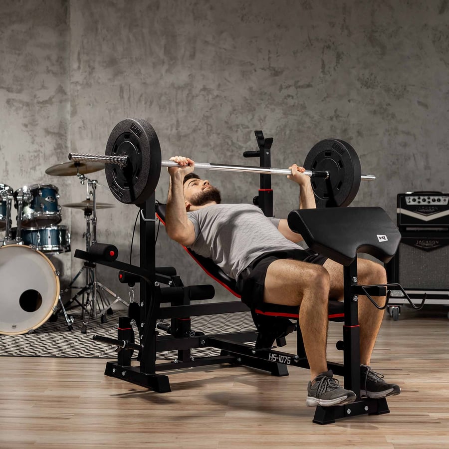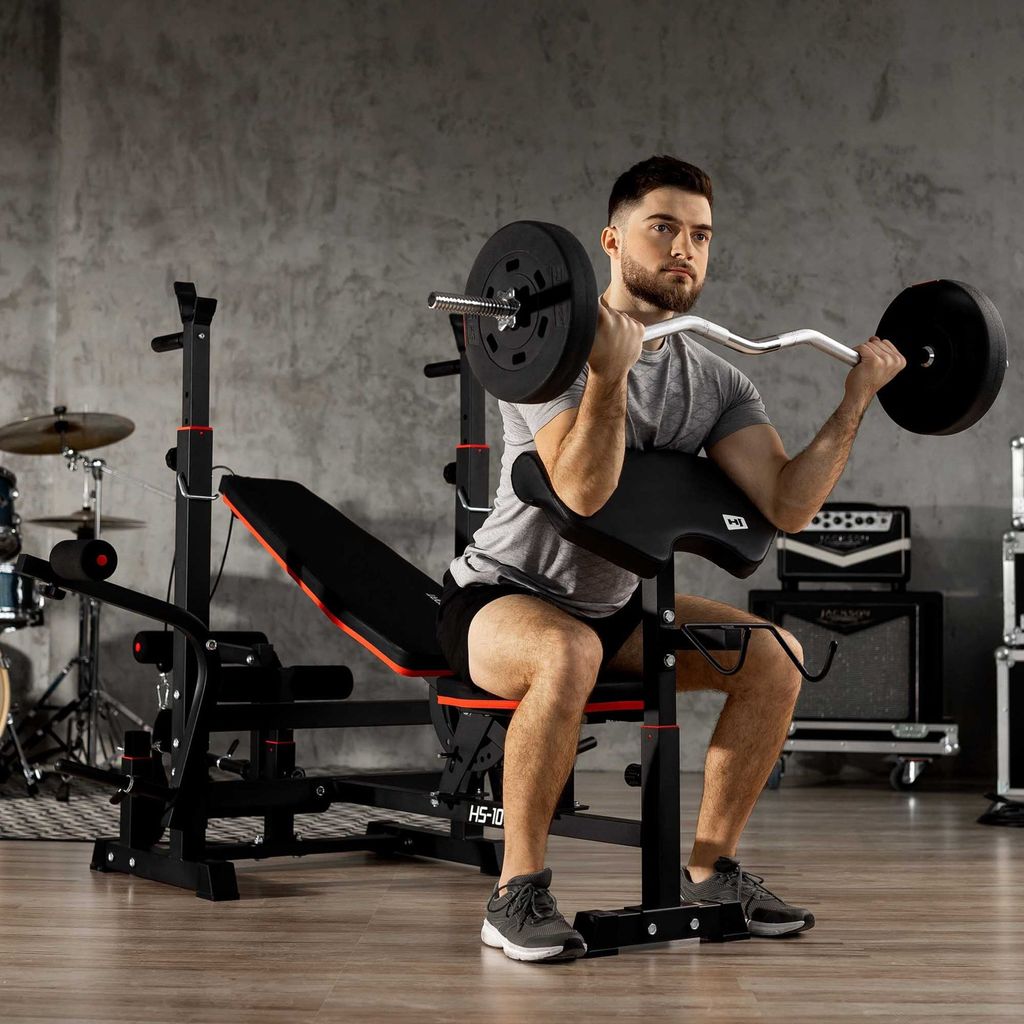 Mit dieser Hop-Sport Hantelbank holst du dir das komplette Fitness-Studio nach Hause! Das Komplettset inklusive 106kg Gusseisen-Gewichten (2x15kg, 2x10kg, 4x5kg, 4x2,5kg, 4x1,25kg) plus Langhantel, Curlstange und 2 Kurzhanteln. Die Bank selbst ist ein echter Alleskönner: verstellbare Rückenlehne in 7 Positionen, höhenverstellbare Hantelablage (92-112cm), Curlpult, Beinpresse und Latzugturm. Die stabile Stahlkonstruktion mit 5cm starken Profilen hält bis zu 150kg an der Langhantel aus. Die Polsterung ist wasser- und schweißabweisend, die Gummi-Ablagen dämpfen das Geräusch beim Ablegen. Perfekt für Einsteiger und Fortgeschrittene - und bis 116kg erweiterbar! Die Gewichte aus massivem Gusseisen sind lackiert und haben geprägte Gewichtsangaben. So kannst du Bankdrücken, Curls, Beinpresse, Latzug und vieles mehr trainieren - alles mit einem Gerät. Made in Germany Qualität zum fairen Preis!