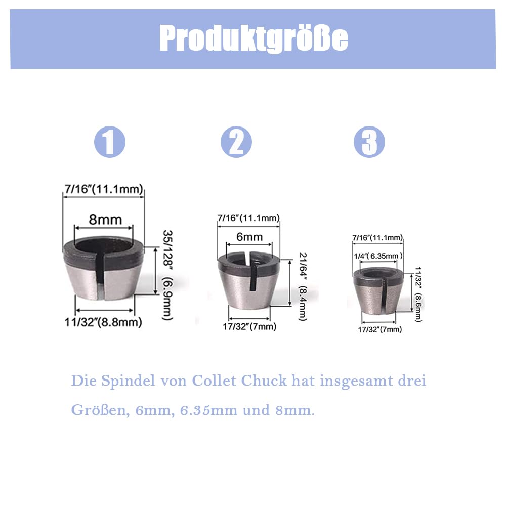 Handwerker und Hobby-Fräser aufgepasst! Dieses HaoTrade Spannzangen Set mit 3 Adaptern in 6 mm, 6,35 mm und 8 mm ist genau das richtige für deine Werkstatt. Aus hochwertigem Stahl gefertigt - rostfrei, korrosionsbeständig und super langlebig. Die präzise Gravur der Spannzangenfutter garantiert eine enge und stabile Klemmung die deine Arbeitseffizienz steigert. Einfach zu bedienen mit guter Flexibilität und Verschleißfestigkeit. Perfekt für den Ein- und Umbau von Graviermaschinen, Schneidemaschinen, Fräsern und Holzbearbeitungsgeräten. Erweitere den Anwendungsbereich deiner festen Gravierköpfe und mach deine Maschinen vielseitiger! Ob für Holz, Metall oder Kunststoff - diese Adapter halten was sie versprechen. Deutsche Qualität zum fairen Preis - was will man mehr?