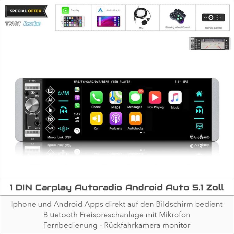 Passt in alle 1 DIN Schächte - universell kompatibel. Mit USB-Anschluss für Flash-Laufwerke und Ladefunktion. Zlink für einfache Smartphone-Spiegelung.