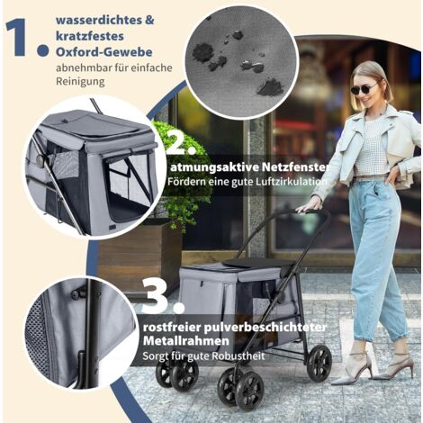 Dein pelziger Freund reist stylisch! Dieser praktische Hundewagen bietet Komfort und Sicherheit für Ausflüge. Mit 65x41x45cm Innenmaßen findet auch größere Hunde Platz. Die Belastbarkeit von 40kg ist ideal für mittelgroße Tiere. Aus wasserdichtem Oxford-Gewebe mit rostfreiem Metallrahmen für maximale Haltbarkeit. Die atmungsaktiven Mesh-Fenster sorgen für gute Belüftung und Sichtkontakt. Vier EVA-Räder mit Dämpfung gleichen Unebenheiten aus - vordere Räder 360° drehbar. Praktische Seitentaschen und Ablagefächer für Zubehör. Einfach zusammenklappbar auf 65x41x45cm für platzsparende Aufbewahrung. Weiche Polsterung und Sicherheitsleinen garantieren Komfort. Perfekt für Stadtspaziergänge, Einkäufe oder Tierarztbesuche. Mach deinem Haustier das Reisen zum Vergnügen!