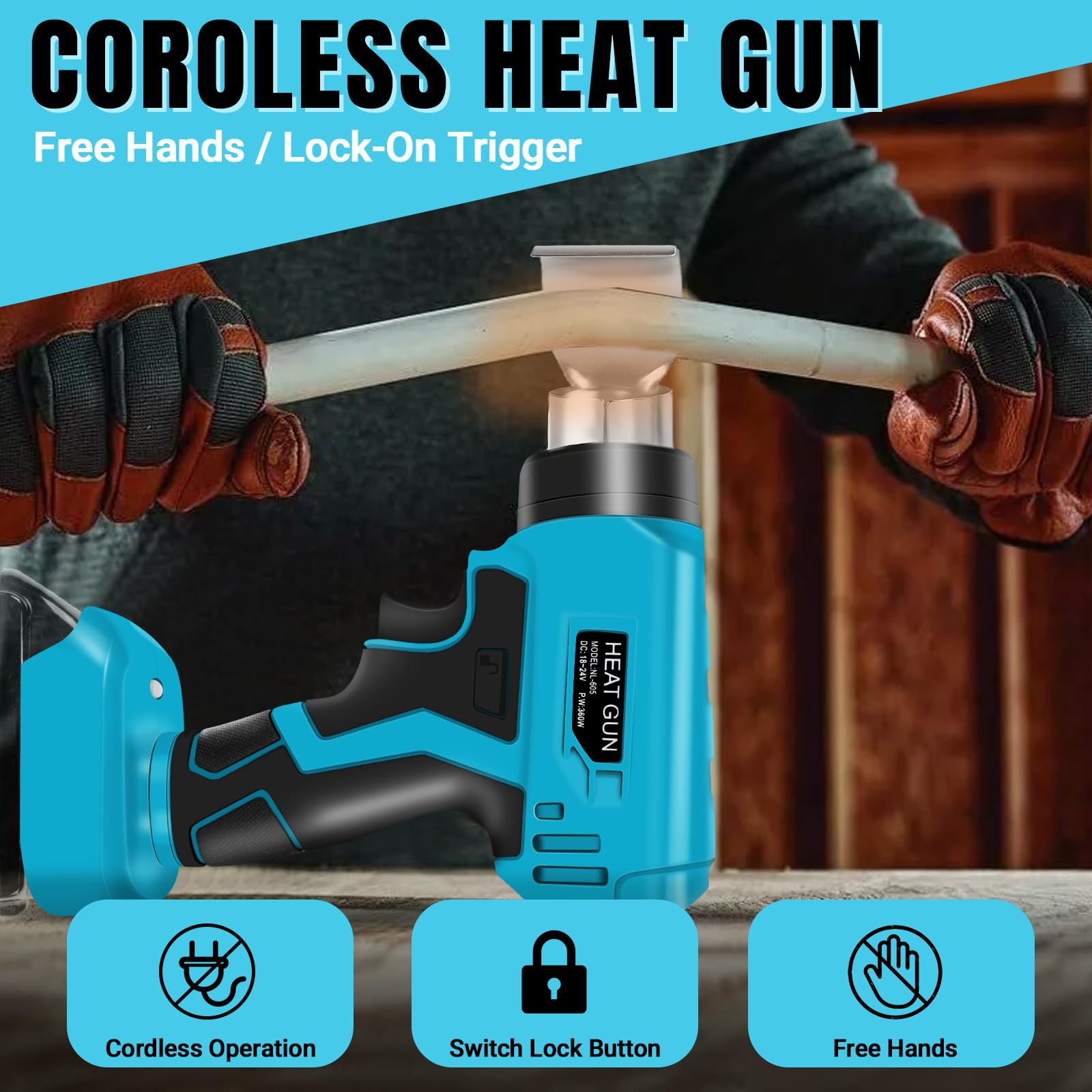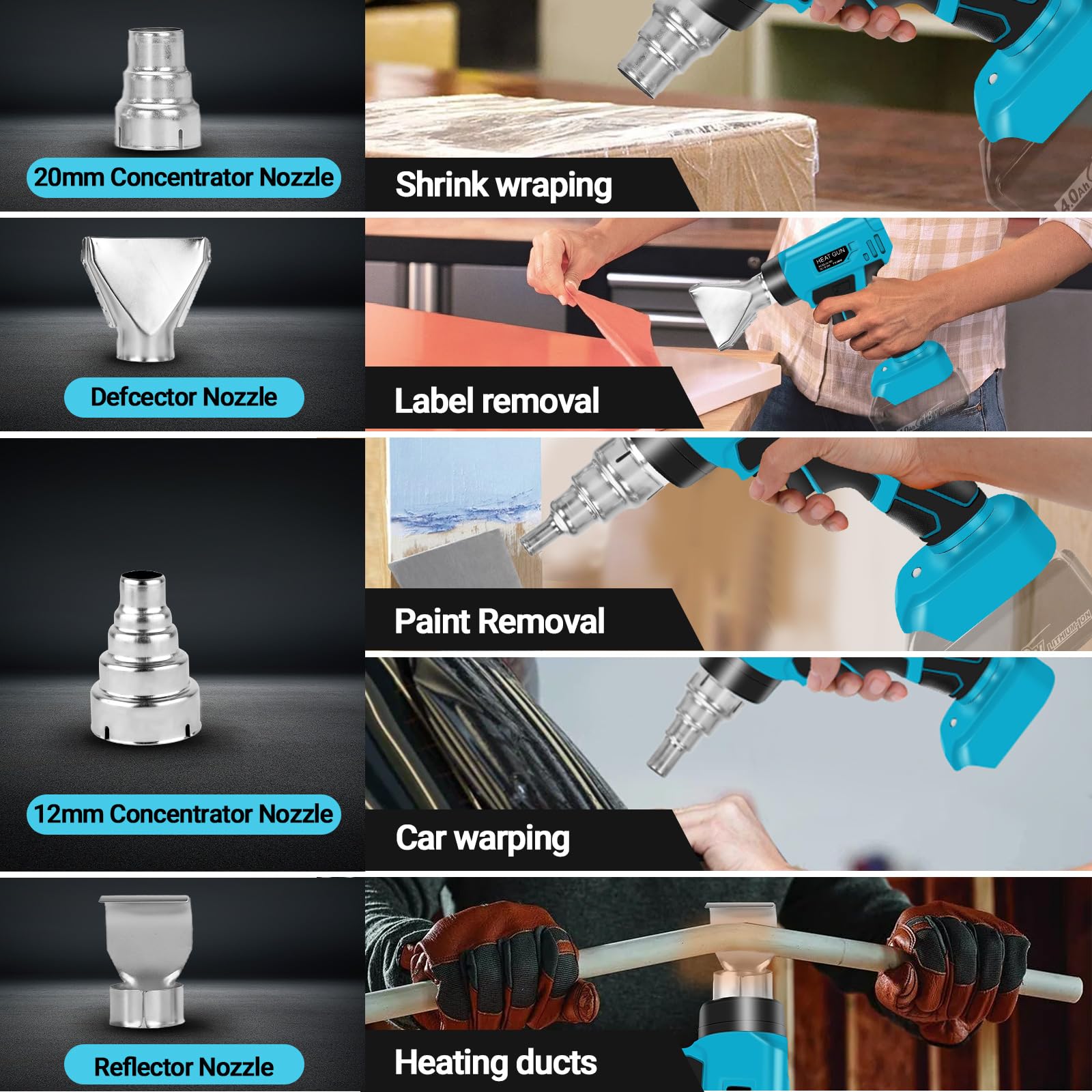 Total praktisch: Diese kabellose Heißluftpistole von WingFly gibt dir volle Bewegungsfreiheit! Kompatibel mit Makita 18V Akkus (BL1840, BL1850, BL1860 etc. - Akku nicht im Lieferumfang), erreicht sie Temperaturen bis zu 450°C. Perfekt für alle Heimwerker-Projekte: Entfernen von Farbe und Aufklebern, Kunststoff schweißen, Rohre biegen oder gefrorene Schlösser auftauen. Im Lieferumfang sind 4 verschiedene Edelstahldüsen enthalten für unterschiedliche Anwendungen. Der rutschfeste Gummigriff liegt gut in der Hand und wird nicht heiß. Mit Überhitzungsschutz für mehr Sicherheit. Achtung: Nicht als Haartrockner verwenden und nie auf Personen oder Tiere richten! Ein vielseitiges Werkzeug für Werkstatt, Haushalt und Reparaturen.