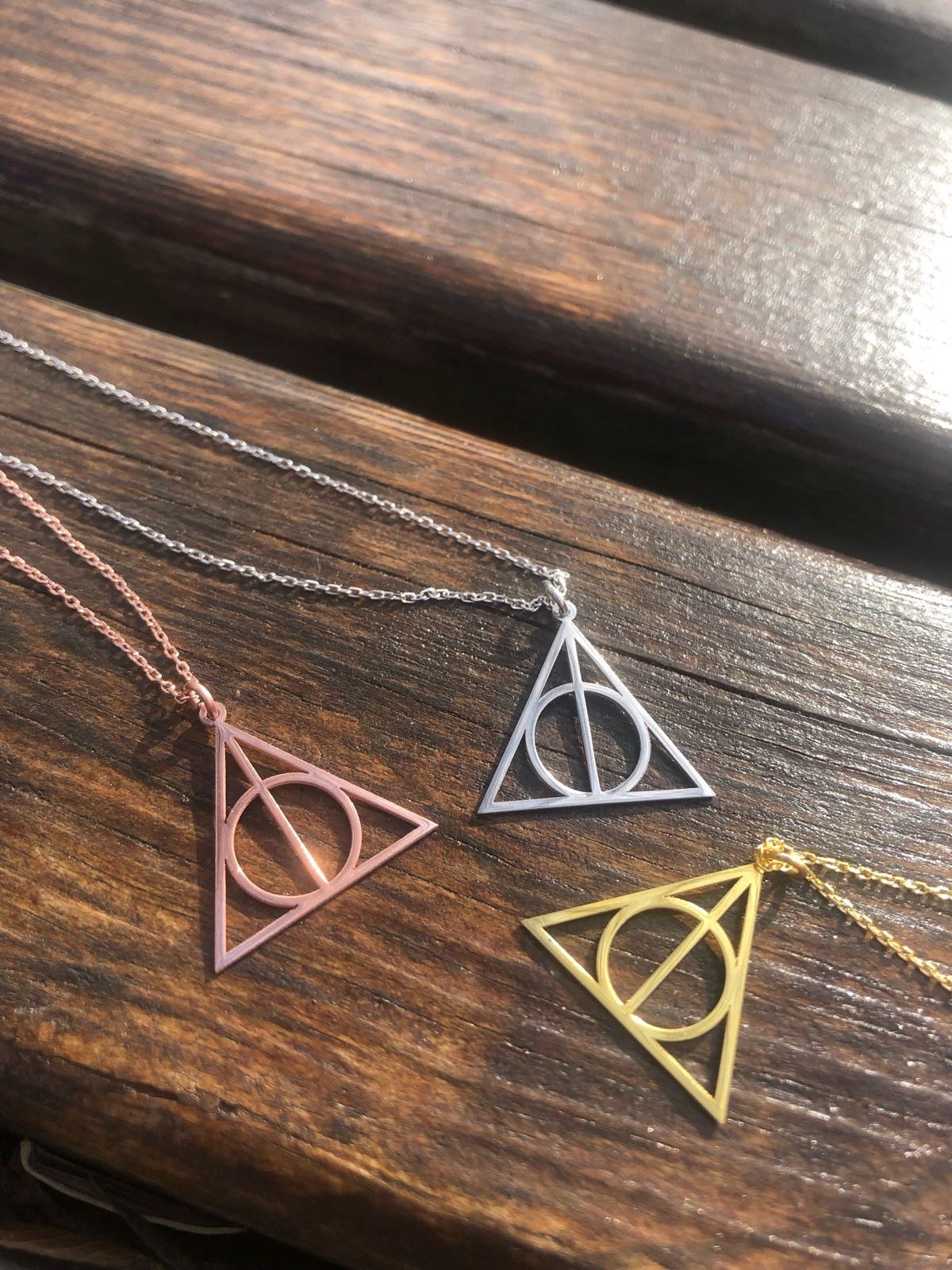Für alle Harry Potter Fans! Dieser Anhänger zeigt die berühmten Heiligtümer des Todes: Den Tarnumhang, den Auferstehungsstein und den Elderstab. Ein Muss für jede Potterhead-Sammlung!