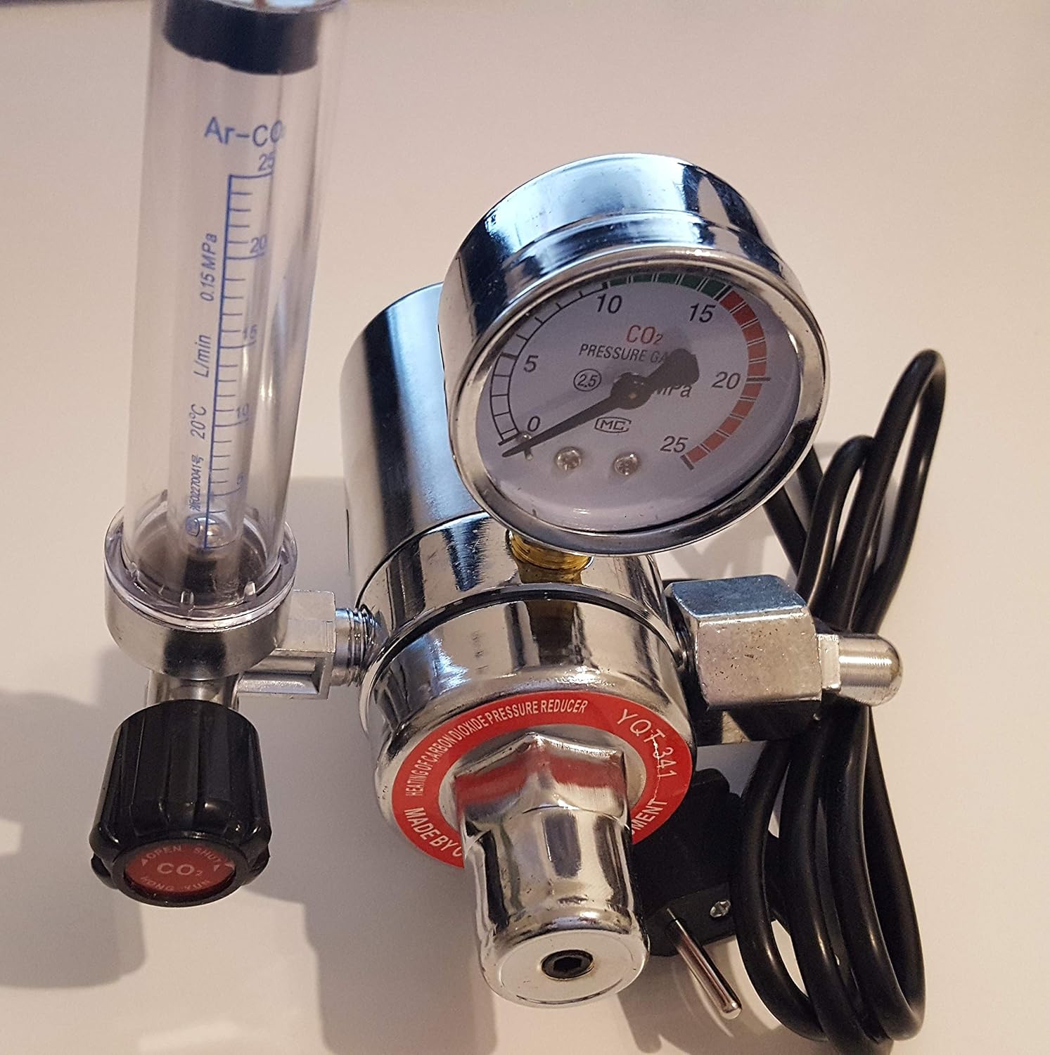 Professioneller CO2 Druckminderer mit elektrischer Heizung! Verhindert Vereisung bei hohem Gasfluss. Automatisches Druckminderventil - öffnet sich bei zu hohem Ausgangsdruck zur Dekompression. Aus Metall, goldene Farbe, mit klarer Skala. G5/8\ Gewinde, Maße ca. 18x15x17cm. Perfekt für Werkstückschweißen, Baustellen, mechanische Wartung und Gebäudedekoration. Hochwertige Verarbeitung für lange Lebensdauer und präzise Druckregulierung. Das ideale Werkzeug für Handwerker und Profis. Sichere und zuverlässige Druckkontrolle für deine Projekte!