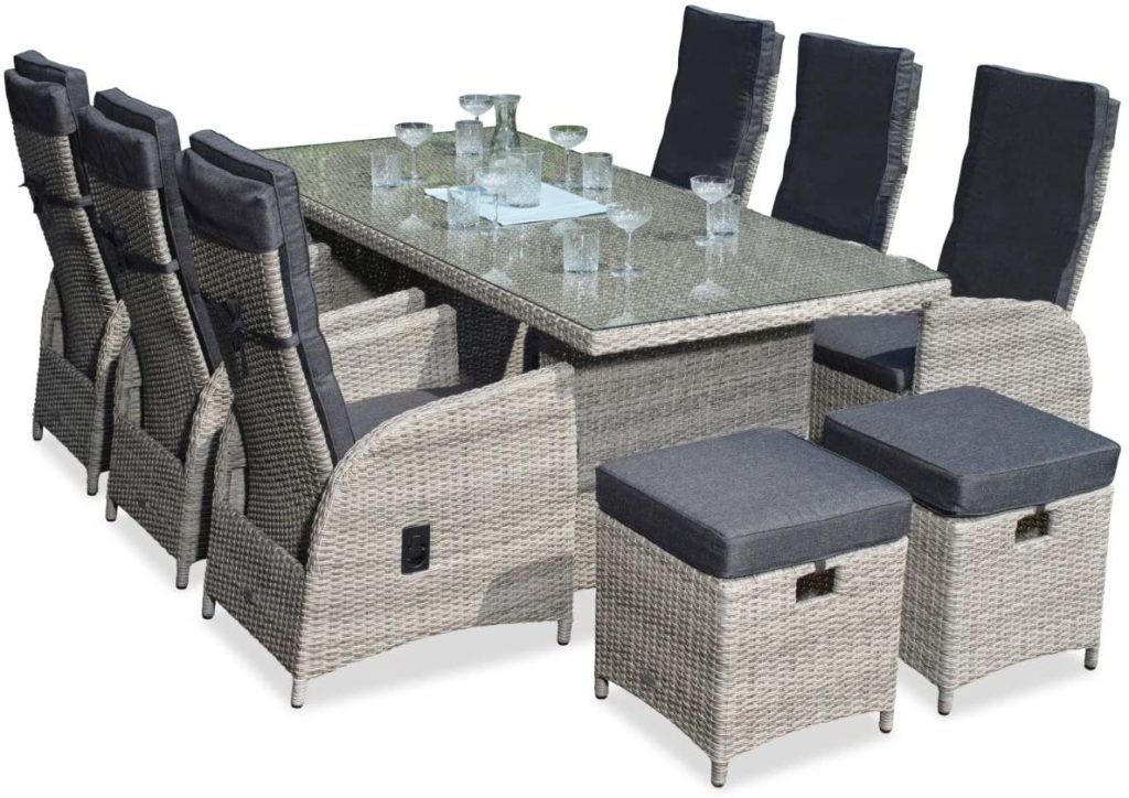 Endlich genug Platz für alle! Diese mega-gemütliche Garten Sitzgruppe Bilbao in Hellgrau bietet bequem Platz für bis zu 7 Personen. Im Set enthalten: ein 3-Sitzer Sofa (180x80x100 cm), zwei Sessel (62x80x100 cm), ein großer Tisch mit Glasplatte (140x83x69 cm) und zwei praktische Hocker (63x52x46 cm). Das Besondere: Die Rückenlehnen von Sofa und Sesseln sind stufenlos verstellbar - perfekt zum Relaxen nach dem Grillen! Die dicken 10 cm Polster sind super bequem und die Bezüge einfach bei 30°C waschbar. Hergestellt aus wetterfestem Polyrattan mit rostfreiem Aluminiumgestell, kannst du die Möbel das ganze Jahr über draußen stehen lassen. Die Hockerkissen verrutschen nicht und die leichten Möbel lassen sich einfach umstellen. Perfekt für gemütliche Abende mit Freunden oder Familienfeiern im Garten. Einfach mit feuchtem Tuch abwischen und schon sieht's aus wie neu!