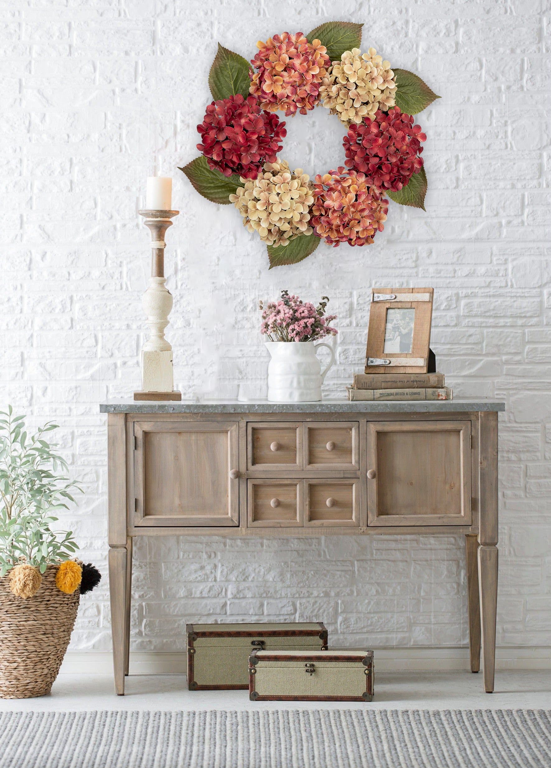 Bring herbstliche Gemütlichkeit in dein Zuhause! Dieser wunderschöne 61 cm große Hortensien-Kranz verwandelt deine Haustür, Wand oder deinen Kamin in eine einladende Herbstoase. Handgefertigt mit ultrarealistischen Seidenblumen in warmen Herbstfarben: tiefes Orange, Burgunder, Gelb und erdige Grüntöne. Neben üppigen Hortensien findest du auf dem Kranz auch pfingstrosenartige Blüten, künstliche Beeren, Ahornblätter, Tannenzapfen und saisonale Akzente. Die hochwertigen Materialien aus Seide und Kunststoff sind lichtbeständig und benötigen weder Wasser noch besondere Pflege - einfach aufhängen und jahrelang Freude haben! Mit integrierter Aufhängeöse für einfache Montage an Haken, Kranzhaltern oder Wandnägeln. Perfekt für Thanksgiving, Halloween oder einfach als herbstliche Deko im Landhausstil oder eleganten Herbstlook. Ob an der Haustür, im Flur, über dem Kamin oder als Tischdekoration - dieser Kranz verbreitet sofort eine warme, einladende Atmosphäre. Ein echter Hingucker, der garantiert Komplimente gibt!
