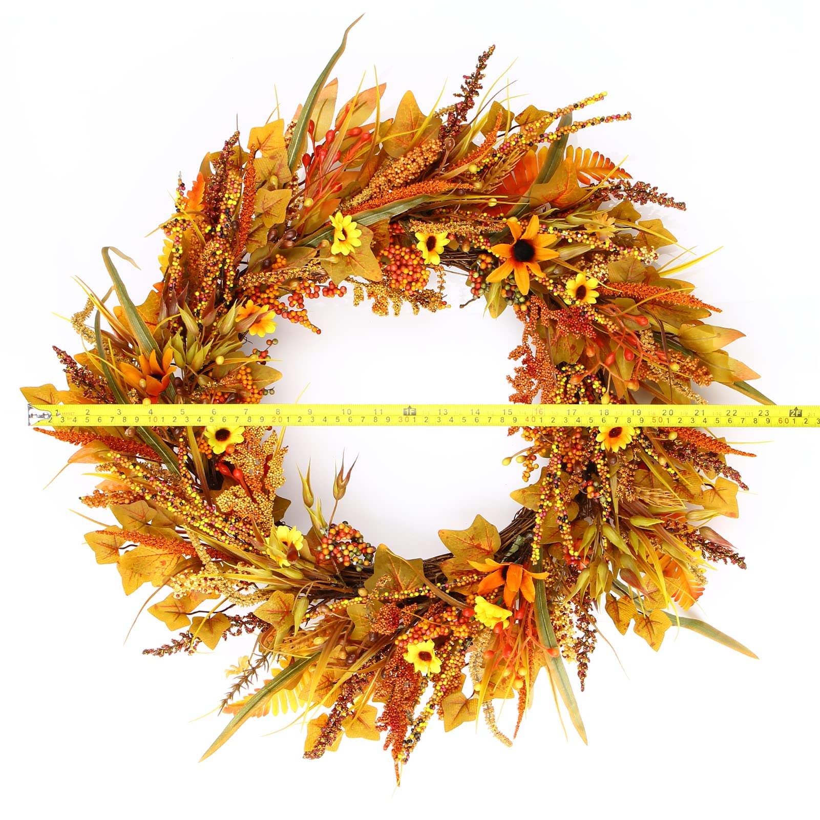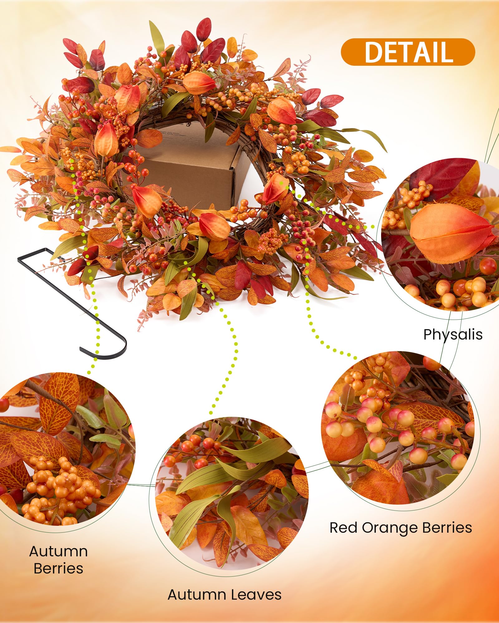 Herbstzeit ist Kranzzeit! Dieser wunderschöne Herbstkranz bringt gemütliche Stimmung an deine Haustür. Mit kunstvollen Beeren und Blättern in warmen Orange- und Rottönen - sieht täuschend echt aus! Aus hochwertigem ABS-Material, ca. 35x35x8cm groß und nur 200g leicht. Perfekt für Thanksgiving, Erntedank oder einfach so als herbstliche Dekoration. Ob an der Haustür, am Fenster oder an der Wand - dieser Kranz ist ein echter Hingucker. Kommt komplett fertig, musst nur noch aufhängen. Auch ein super Geschenk für alle, die ihr Zuhause herbstlich schmücken wollen!