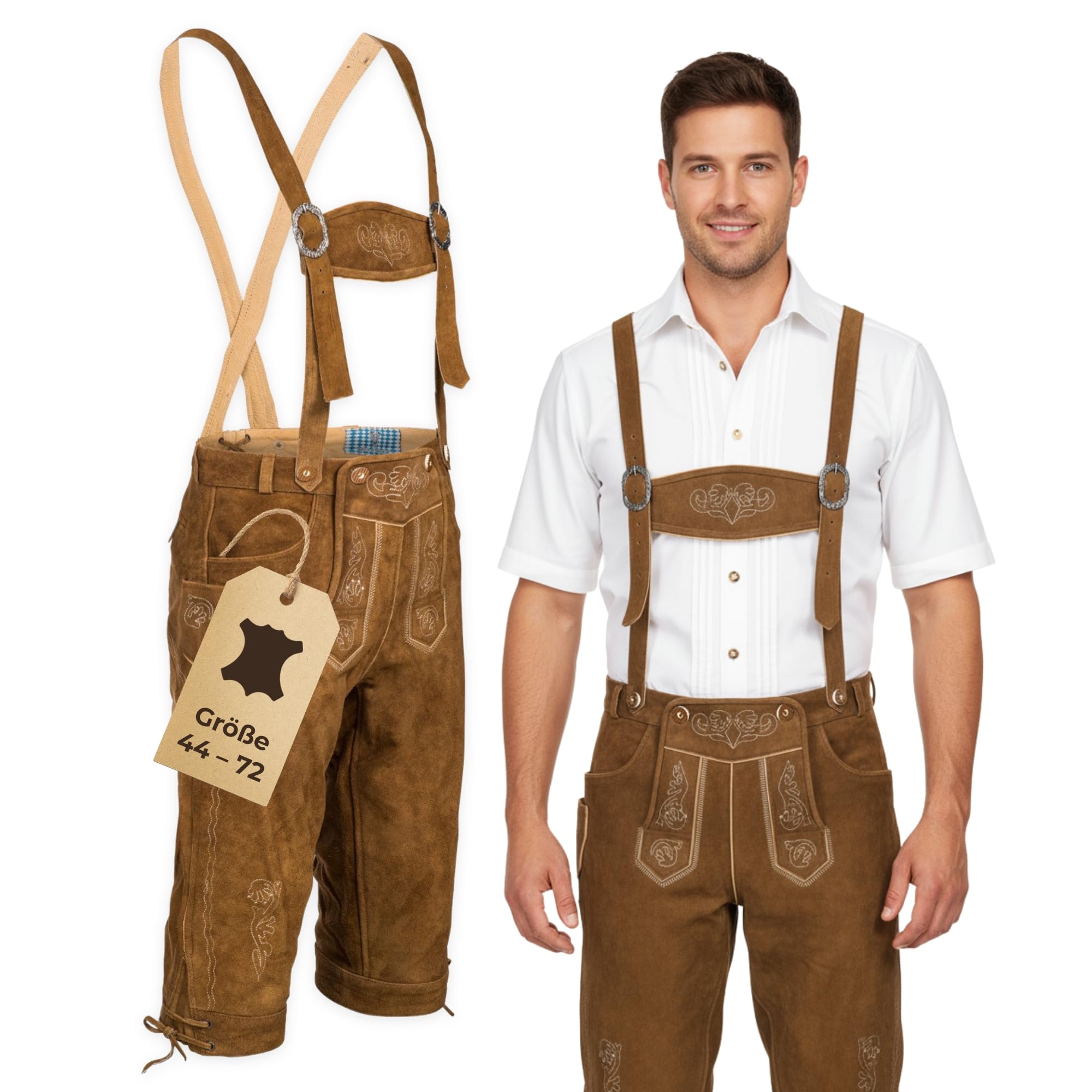 • Tatla Traditionelle Lederhose Herren - Braune Kniebundhose Mit Stickerei & Hosenträger