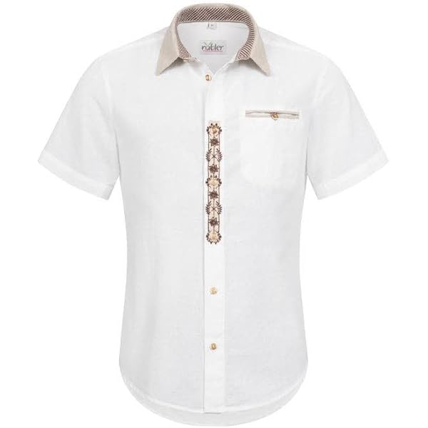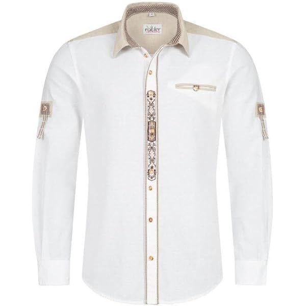 Das Nübler Trachtenhemd bringt bayerische Tradition in deinen Alltag! Aus 100% Baumwolle gefertigt, überzeugt es durch seine angenehm zu tragende, leicht unregelmäßige Webstruktur. Der Regular Fit sorgt für optimale Bewegungsfreiheit - ob beim Tanzen, Feiern oder einfach nur Entspannen. Die Brusttasche und der Liegekragen sind mit einem sandfarbenen Leineneinsatz abgesetzt, was dem Hemd eine besondere Note verleiht. Die Knopfleiste in Hirschhornoptik mit aufwendiger Stickerei rundet den authentischen Trachtenlook perfekt ab.