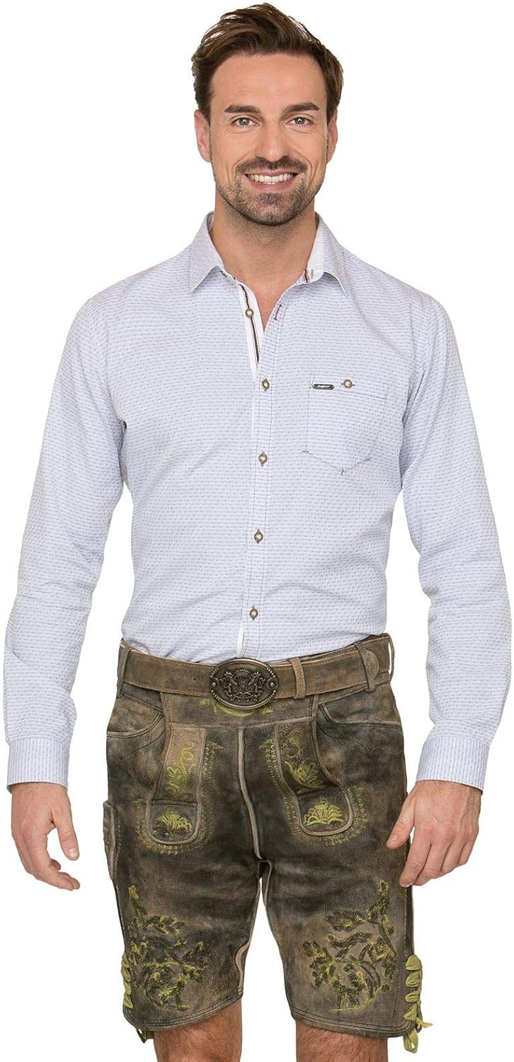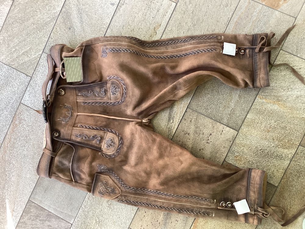 Mann, diese Stockerpoint Lederhose ist ja ein richtiger Hingucker! Der 'Georg' besticht durch aufwendige Stickereien auf dem Latz und an den Beinen - das sieht einfach klasse aus! Aus weichem, anschmiegsamem Leder gefertigt, das super bequem sitzt. Der Latz schließt mit Knöpfen und an den Beinen kannst du die Weite anpassen. Mit praktischem Ledergürtel in antiker Optik für perfekten Halt. Neben den Eingriffstaschen vorne und Gesäßtasche gibt's sogar eine kleine bestickte Tasche am Hosenbein. Ob für den Alltag oder festliche Anlässe - mit dieser Lederhose machst du immer eine gute Figur! Die Bundweite ist hinten durch ein Lederband regulierbar - sitzt also immer perfekt. Ein echter Eye-Catcher für alle, die traditionelle Kleidung mögen - aber mit modernem Komfort!