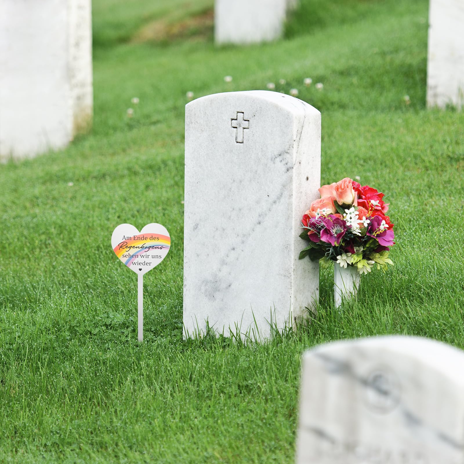 Eine zarte Erinnerung für deine Liebsten. Dieses Edelstahl-Herz mit der berührenden Aufschrift 'Am Ende des Regenbogens sehen wir uns wieder' ist die perfekte Grabbekoration. Mit 28x12 cm Größe auffällig aber dezent. Aus hochwertigem Edelstahl, komplett wetterfest und rostfrei - hält auch bei strengem Frost. Leicht und einfach zu installieren, bleibt auch bei starkem Wind sicher stehen. Eine würdevolle Art, Liebe und Erinnerung auszudrücken.
