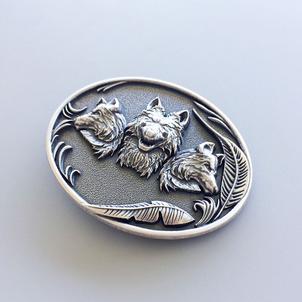 Wilde Western-Vibes für deinen Style! Diese coole Gürtelschnalle zeigt einen stolz heulenden Wolf, umrahmt von Ranken und Federn. Aus massivem Metall in silber mit antikem Finish. Maße: 9x7 cm, für Gürtel bis 4 cm Breite. Gewicht: 95 Gramm - spürbar hochwertig! Perfekt für Country-Fans, Western-Liebhaber oder alle die etwas Besonderes suchen. Verleiht Jeans, Lederhosen oder jedem anderen Outfit sofort Charakter. Ein echter Hingucker der Gespräche garantiert!