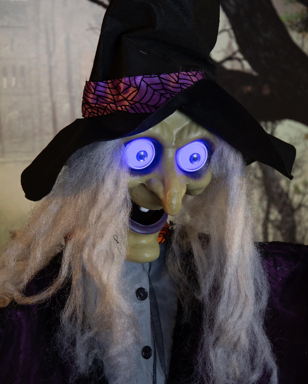 Boo! Diese gruselige Halloween-Hexe ist der absolute Hingucker für deine Halloween-Deko! Mit etwa 30cm Höhe und klassischem Hexen-Outfit inklusive langen grauen Haaren und schwarzem Hut. Das Besondere: Sie reagiert auf Geräusche und Bewegung! Durch Klatschen, Sprechen oder Schritte beginnt sie, gruselige Geräusche von sich zu geben und ihre Augen leuchten unheimlich. Aus Harz, Stoff und Bambusholz gefertigt - leicht aber langlebig. Einfach mit dem oben angebrachten Seil aufhängen: an Bäumen, Türen oder in Treppenhäusern. Wird in rot, grün oder schwarz geliefert (Zufallsprinzip). Batterien benötigt - dann kann der Gruselspaß beginnen! Perfekt für Halloween-Partys oder um unerwünschte Besucher zu erschrecken!