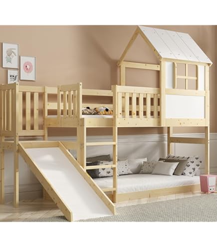 Das Traumbett für dein Kind! Dieses wunderschöne Etagenbett von EINHOM verwandelt jedes Kinderzimmer in eine gemütliche Spiel- und Schlafoase. Mit 90x200cm Liegefläche bietet es genug Platz zum Träumen und Toben. Das niedliche Dach-Design und die zwei kleinen Fenster unten machen es zu einem echten Abenteuer-Bett! Aus Kiefernholz und MDF gefertigt, in der frischen Farbkombination Weiß und Natur, passt es in jedes Zimmer. Das obere Bett hat ein sicheres Schutzgitter rundherum, damit dein Kind sicher schlafen kann. Unten ist bewusst kein Lattenrost vorhanden - so kannst du den Raum frei gestalten, zum Beispiel mit einer zweiten Matratze, Spielzeugkisten oder einem gemütlichen Spielbereich. Mit der praktischen Treppe kommt dein Kind sicher nach oben. Einfach aufbauen mit der beiliegenden Anleitung - die Teile kommen in zwei Paketen (können auch mal versetzt ankommen). Dein Kind wird dieses Bett lieben!