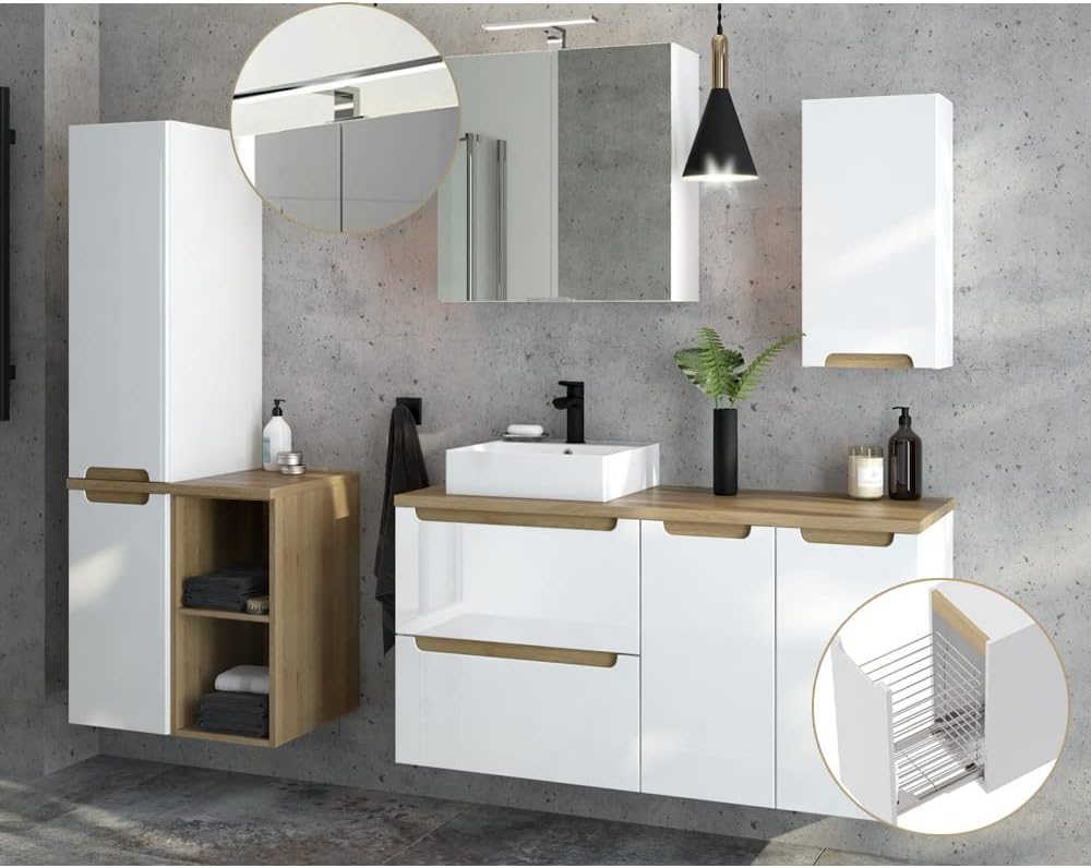 Wow, dieses Lomadox Waschtisch-Set macht dein Badezimmer zum echten Hingucker! Das 120cm große Set in Hochglanz weiß besteht aus einem Waschtisch mit Unterschrank und einem coolen 3D-Spiegelschrank mit LED-Beleuchtung. Der Korpus ist aus E1-Spanplatte mit Melaminbeschichtung, die Fronten aus tiefgezogenem MDF - richtig hochwertig! Der Unterschrank hat 2 Vollauszug-Schubkästen mit Softclose-Funktion und 2 Türen mit Dämpfung. Das Mineralgussbecken hat ein Hahnloch und Überlauf - praktisch und stylisch. Der Spiegelschrank hat 3D-Spiegeltüren, 6 Glaseinlegeböden und 2 verchromte LED-Leuchten (je 30cm, 7 Watt, 4000 Kelvin). Sogar eine Steckdose ist integriert! Die Metallauszüge und -beschläge sind made in Germany - da stimmt einfach die Qualität. Das Gesamtmaß ist 120cm breit, 200cm hoch und 47cm tief - perfekt für die meisten Badezimmer. Die Lieferung kommt zerlegt, aber die Montage ist mit der bebilderten Anleitung echt einfach. Die Oberflächen sind kratz- und stoßfest - hält also was aus. Ein richtig schickes Set, das dein Badezimmer aufwertet. Ob Neubau oder Renovierung - damit machst du alles richtig! Einfach bestellen, zusammenschrauben und freuen! Dein Badezimmer wird aussehen wie aus dem Magazin - und das zu einem fairen Preis. Perfekt für alle, die stylisch und praktisch zugleich leben wollen!