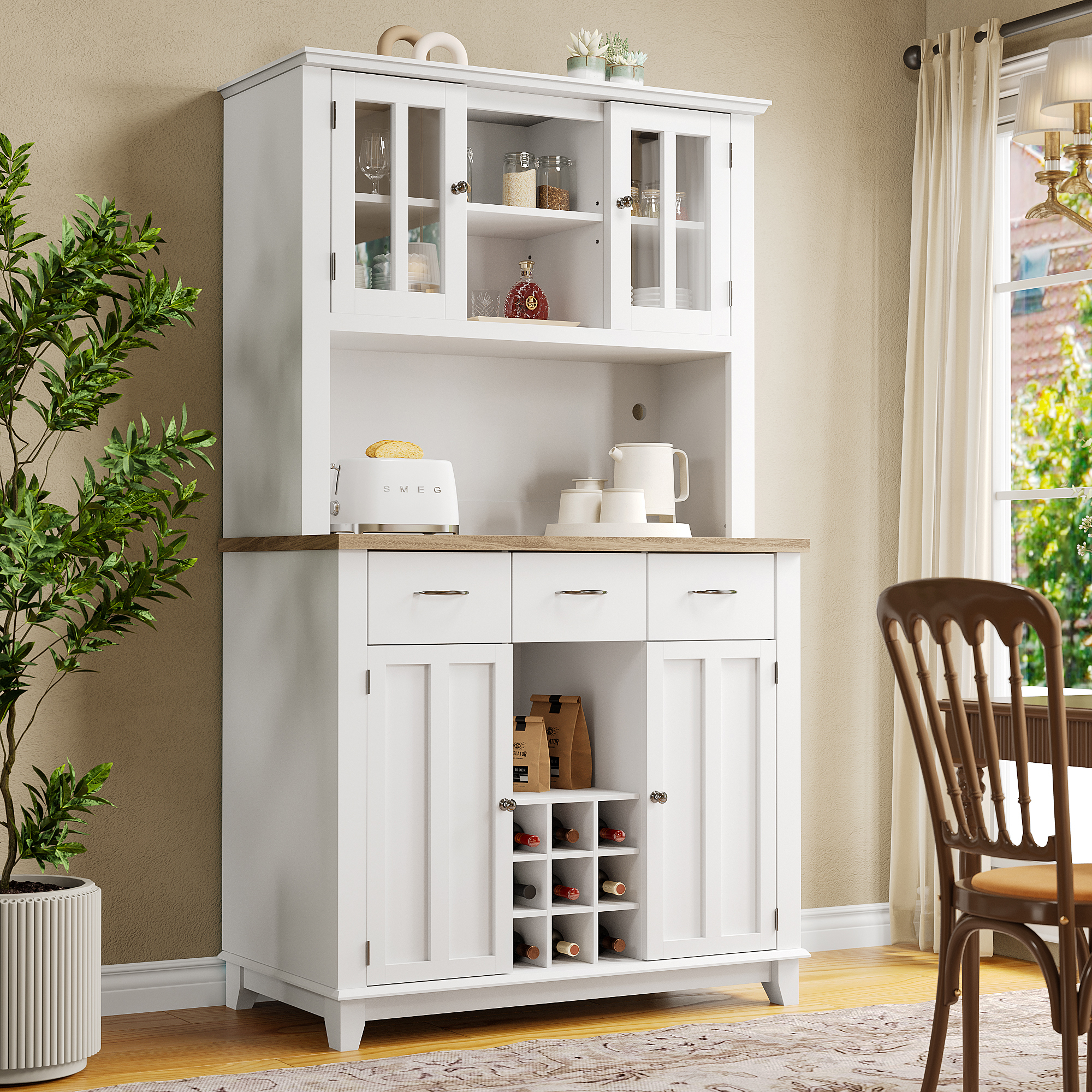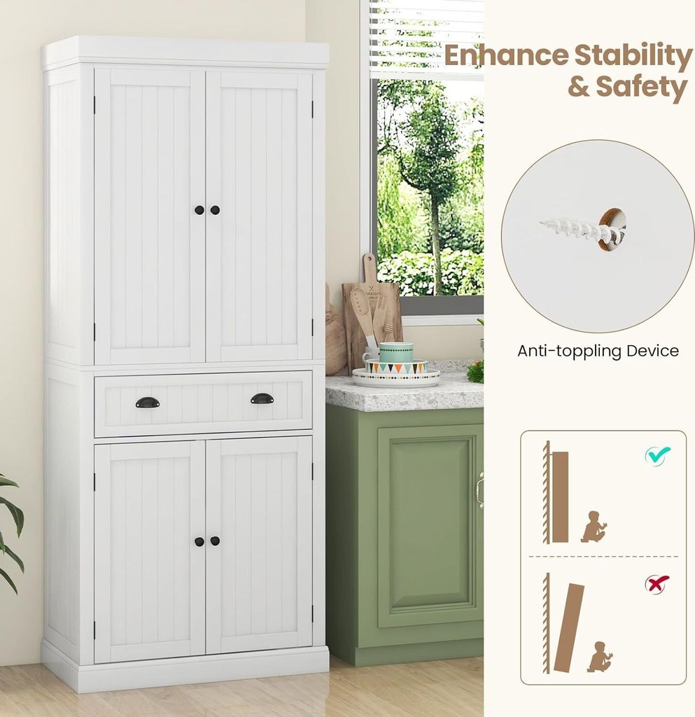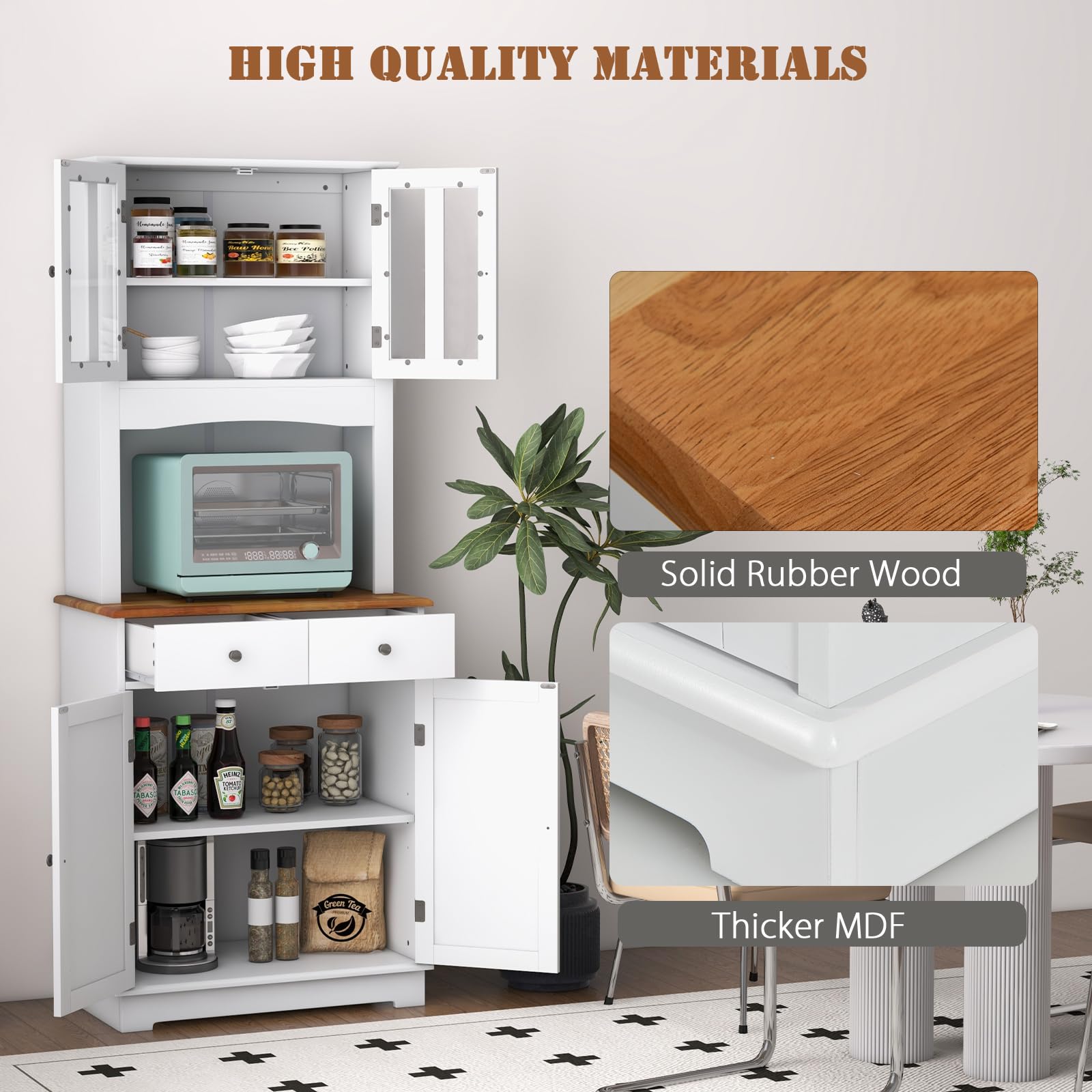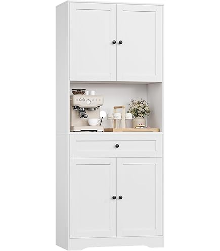 Endlich Ordnung in der Küche! Dieser 170cm hohe Buffetschrank in Schwarz bietet massig Stauraum: 2 Schubladen, verstellbare Regale und eine praktische Arbeitsplatte aus Kautschukholz. Die Glasvitrine oben zeigt dein schönstes Geschirr, während unten alles andere verstaut wird. Mit Kabelmanagement für Steckdosen und magnetischem Türschloss. 68,5x40,5x170cm - perfekt für Vorräte, Küchengeräte oder als stylische Präsentationsfläche. Ein echter Hingucker für jede Küche!