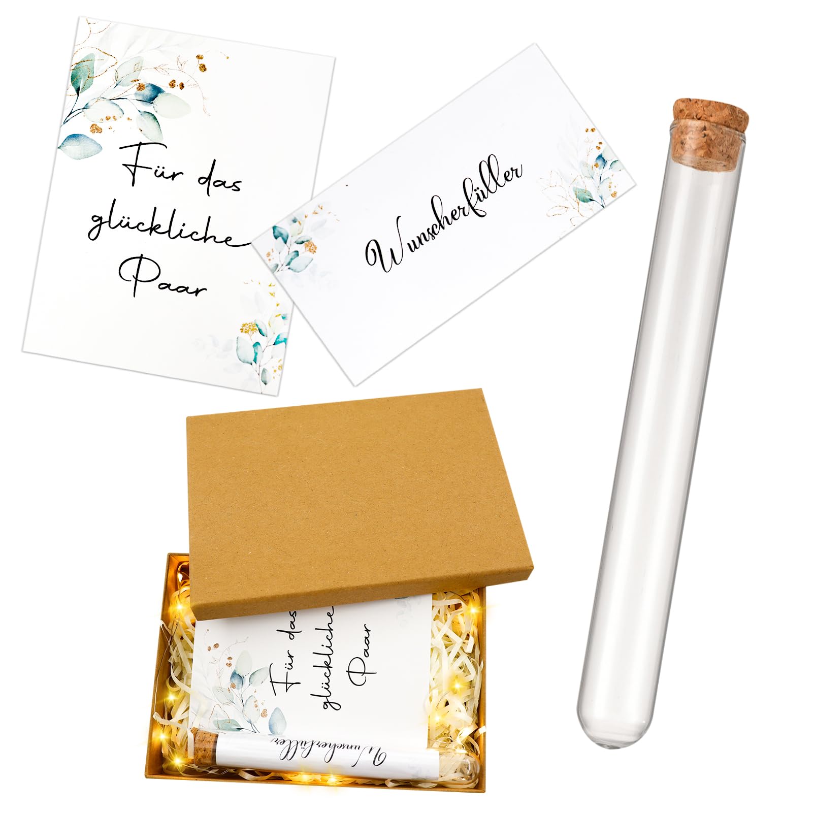 Suchst du nach einer besonderen Art, dem Brautpaar Geld zu schenken? Dieses vollständige Set macht's möglich! Enthalten sind: ein stylisches Reagenzglas aus Kunststoff für das Geld, eine hübsche Geschenkbox, eine romantische Lichterkette, zwei Größen von Grußkarten, Bastband und eine niedliche Champagnerblume. Das Reagenzglas misst ca. 15x2cm - perfekt für Geldscheine. Die Geschenkkarten in 13x10cm und kleiner geben Raum für persönliche Wünsche. Die 1 Meter lange Lichterkette sorgt für gemütliches Licht. Alles in ansprechendem Design, das dem Geschenk eine besondere Note verleiht. Einfach das Geld ins Reagenzglas stecken, Karte beschreiben, alles in der Box arrangieren - und schon hast du ein individuelles Geschenk, das in Erinnerung bleibt. Viel besser als ein langweiliger Umschlag, oder?