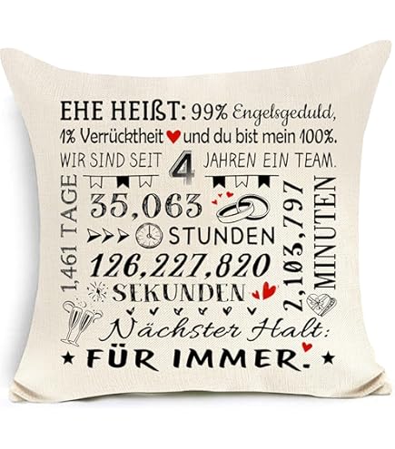Das perfekte Geschenk für Verliebte! Dieser süße Kissenbezug im Format 45x45 cm ist ideal für Paare, die ihren Hochzeitstag feiern. Mit liebevollen Sprüchen und romantischen Botschaften - ob für das 1., 7. oder 25. Jubiläum. Aus hochwertigem Leinenstoff, der sich angenehm weich anfühlt und auch nach dem Waschen nicht ausbleicht. Mit praktischem Reißverschluss für einfaches Beziehen. Perfekt fürs Wohnzimmer, Schlafzimmer oder als Dekoration. Ein Geschenk, das von Herzen kommt und immer wieder an den besonderen Tag erinnert. Ob für die Eltern, Großeltern oder beste Freunde - diese Kissenhülle bringt Lächeln ins Gesicht!