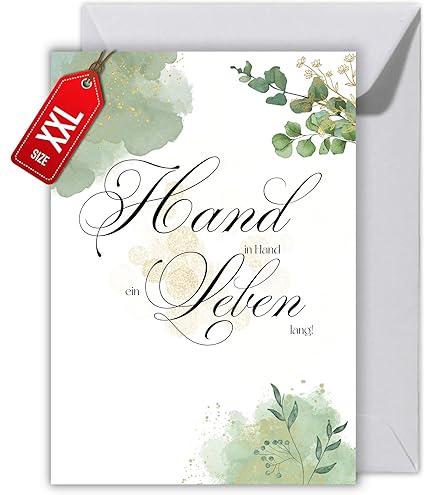 Wow, was für eine wunderschöne Hochzeitskarte! Die Edition Seidel Premium Karte im großen DIN A4 Format (29,7 x 21,0 cm) ist einfach der Hammer für alle, die dem Brautpaar was Besonderes schenken wollen. Das ist keine normale Karte - das ist eine echte Premium-Karte, die richtig was hermacht! Gedruckt in Deutschland auf hochwertigem Papier mit Offsetdruck, einfach top Qualität. Und sie kommt natürlich mit passendem Umschlag, alles perfekt aufeinander abgestimmt. Das junge Kreativteam vom Seidel Verlag hat hier echt ganze Arbeit geleistet - das Design ist modern, trendy und mit viel Liebe gemacht. Als Doppelkarte ohne Innentext kannst du deine persönlichen Glückwünsche selbst reinschreiben. Egal ob für Freunde, Familie oder Kollegen - mit dieser Karte zeigst du, dass du dir wirklich Gedanken gemacht hast. Die Verarbeitung ist absolut hochwertig, man merkt sofort, dass das kein Massenprodukt ist. Perfekt für alle, die was Besonderes suchen und dem Brautpaar eine ganz besondere Freude machen wollen!