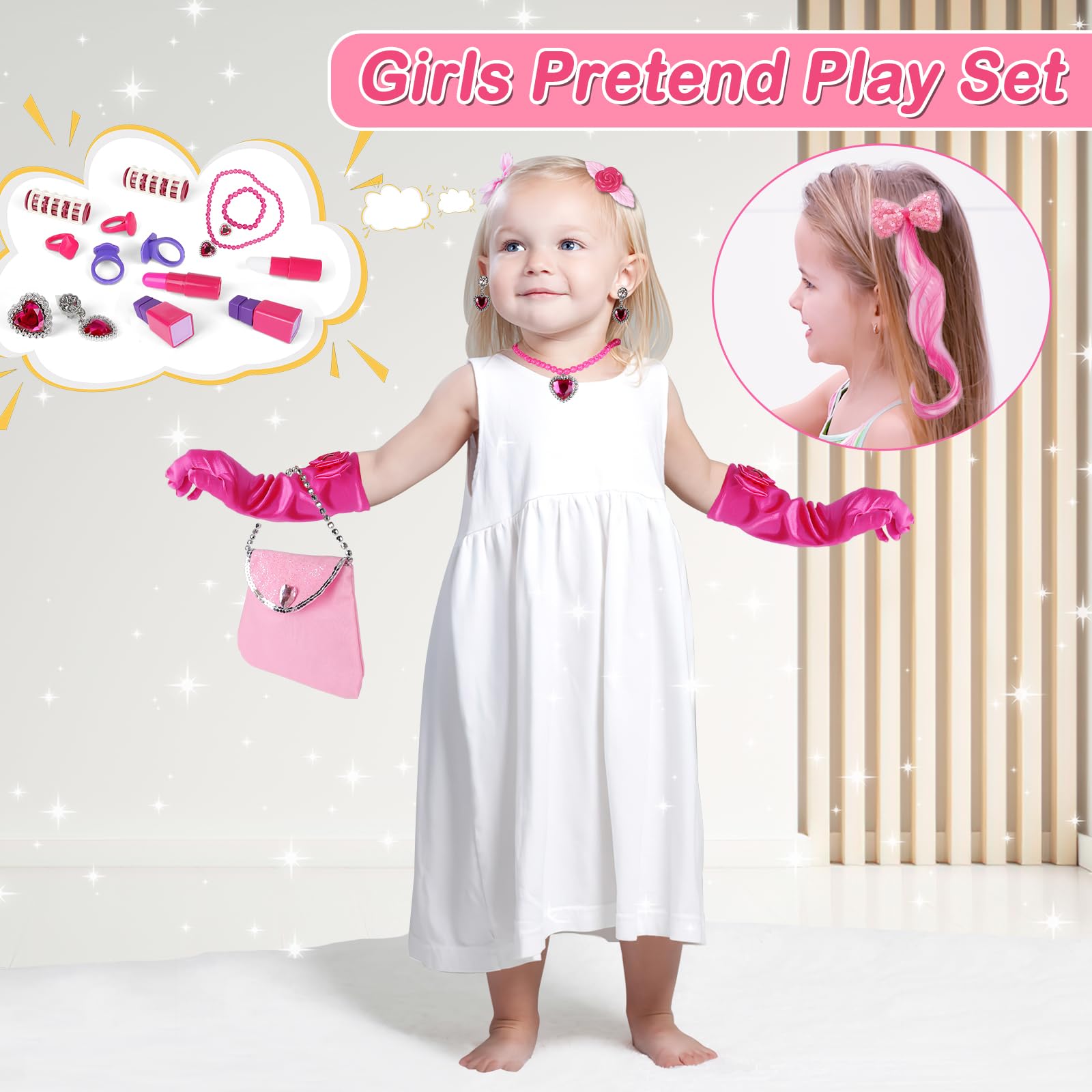 Im Set enthalten: Nagellack, Lippenstifte, Ohrringe, Haarspangen, Kämme, Lockenwickler und ein funkelnder Zauberstab. Der bruchsichere Spiegel und die glatten Kanten sorgen für Sicherheit beim Spielen. Maße: 44x22x76cm - perfekt für Kinder ab 3 Jahren. Einfach ohne Werkzeug zusammengebaut. Die Batterien für die Beleuchtung sind leider nicht dabei. Das ideale Geschenk für Geburtstage, Weihnachten oder einfach als Überraschung für deine kleine Stylistin!